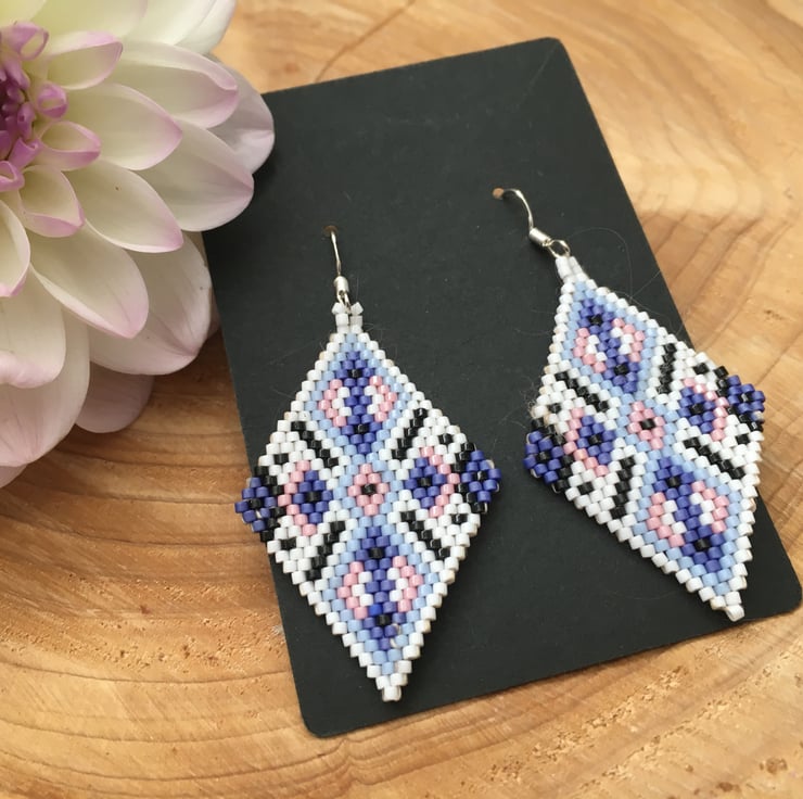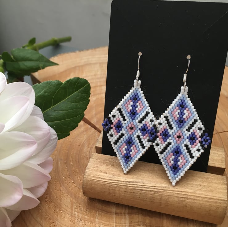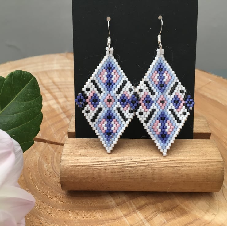 These pretty hand woven earrings are created using tiny glass seed beads to form a diamond shape. A fabulous addition to your earring collection or to gift to a special person. Lovely and light weight and easy to wear. Get the WOW without the weight !