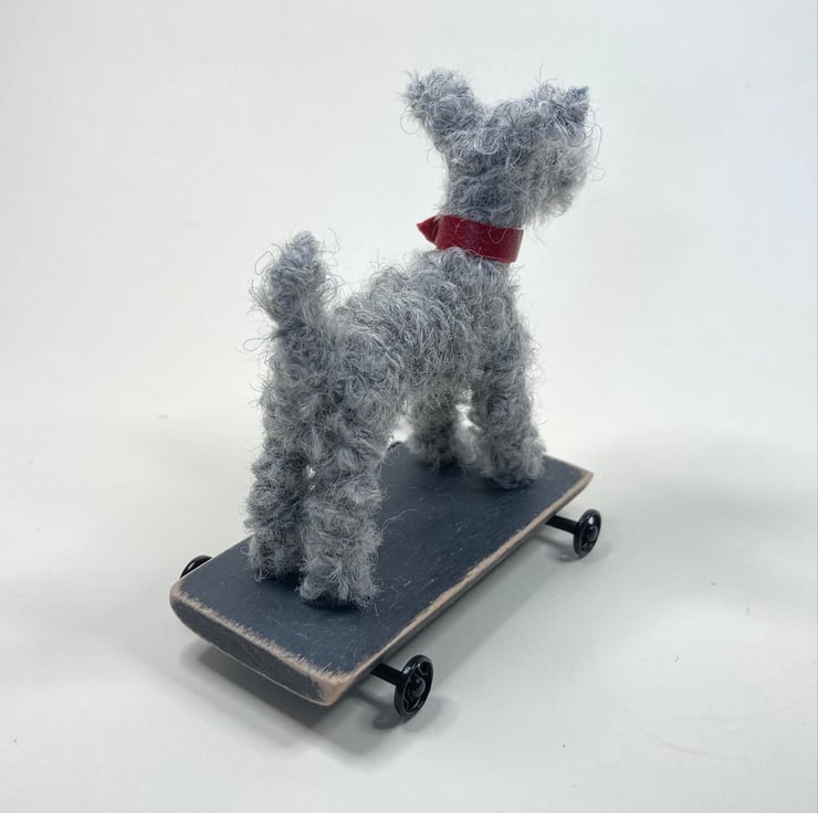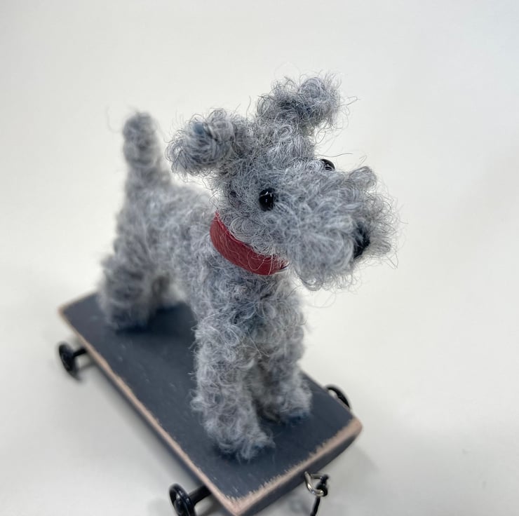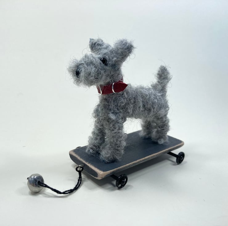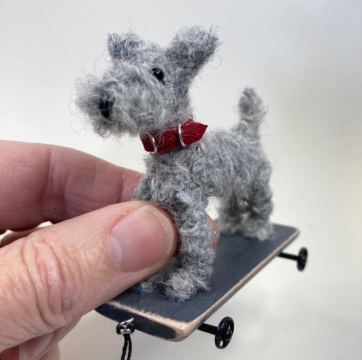 OOAK sculptured miniature terrier on a pull along wooden trolley with wheels. All my animals are hand finished with eyes and noses and ,if needed, wool whiskers! The wheels are for decorative purposes only and do not turn. My animals are not toys but are designed as small pieces of art for display on a shelf - somewhere where they will be admired and loved.