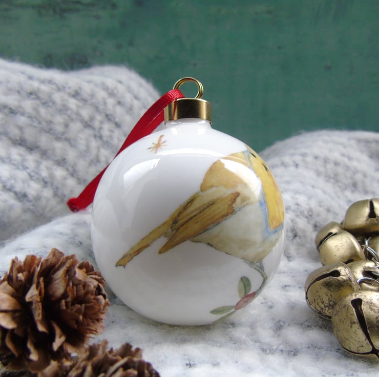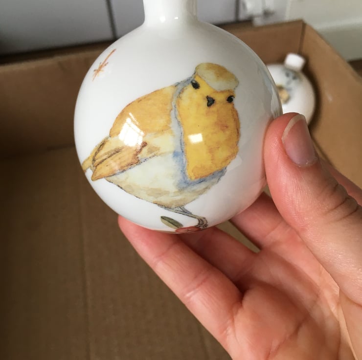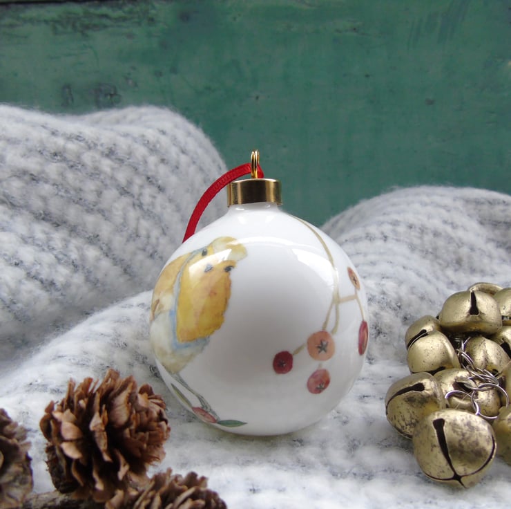 Hand decorated fine bone china Christmas bauble with my watercolour robin illustration. A beautiful heirloom Christmas decoration.