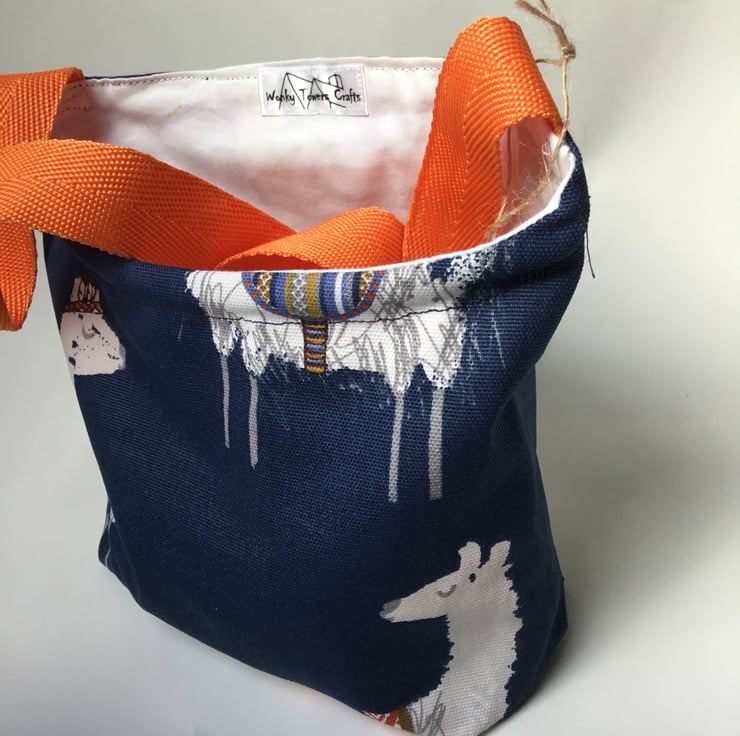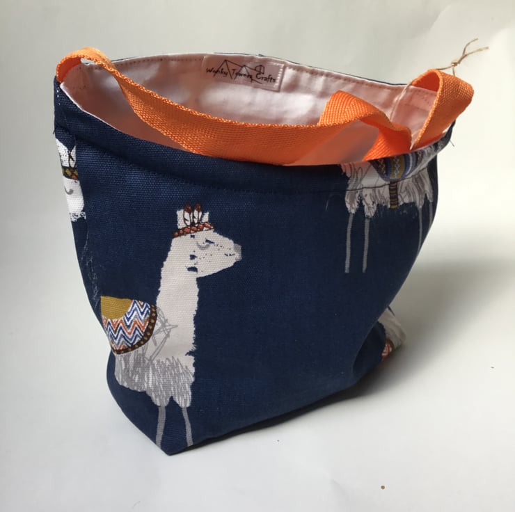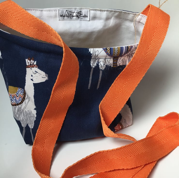 This lovely peg bag is made from gorgeous navy blue cotton, featuring quirky alpaca characters. The lining is plain white and the strap, made from strong polypropylene webbing, is bright orange. The bag measures approximately 22 x 22cm and the strap is 125cm long. It is big enough to hold a good supply of pegs.
