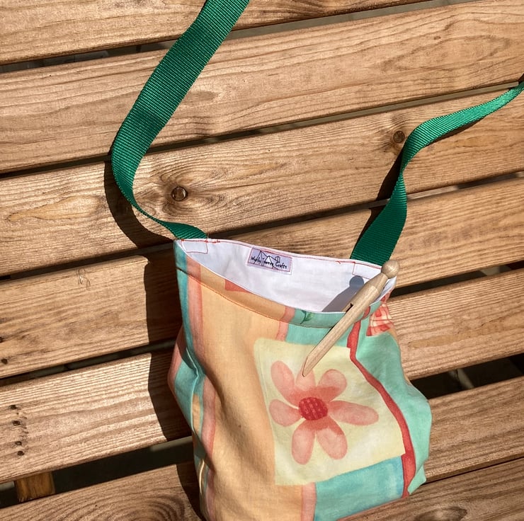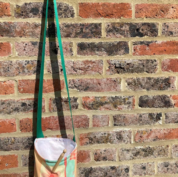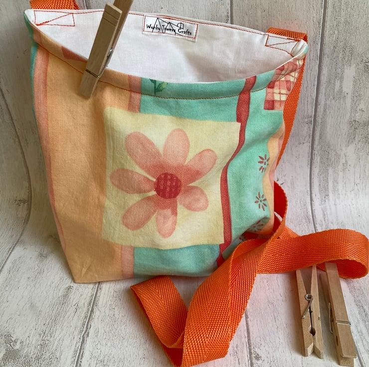 If you’re looking for a handy peg bag with a difference this may be the one for you. It is made from a pretty cotton fabric in a peach and green pastel design. It is lined with plain white cotton and has a strong, bright green strap.
