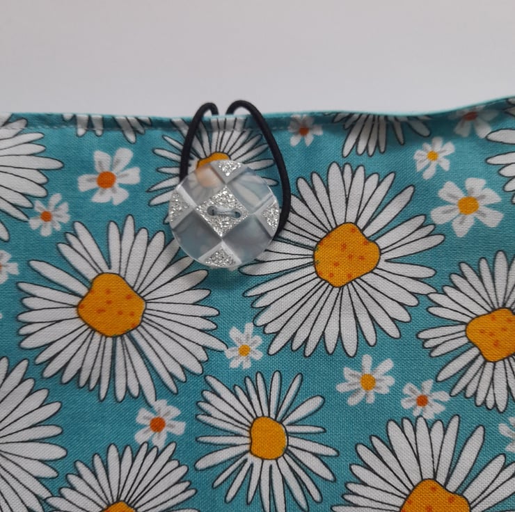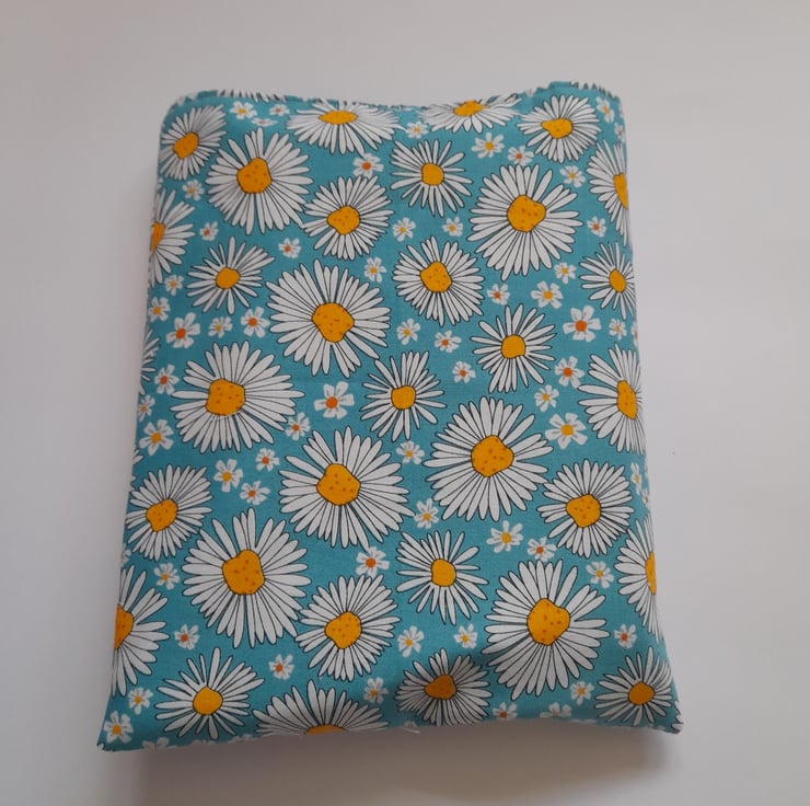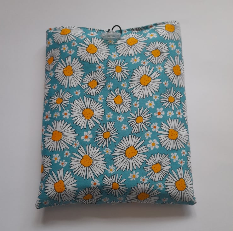 The sleeve is made out of a daisy design cotton fabric on the outside and a pale blue cotton fabric on the inside. The sleeve is padded for extra protection for your book and a button with elastic is used to close your sleeve