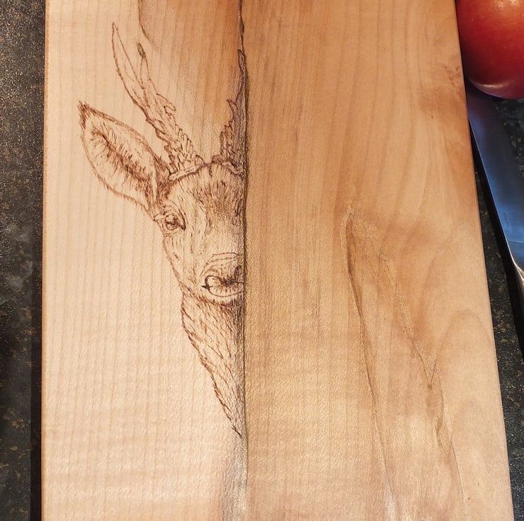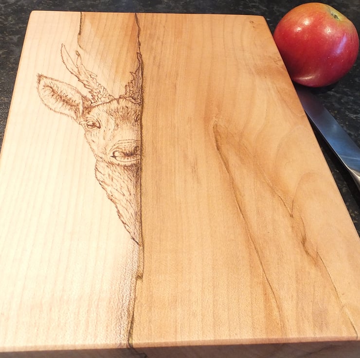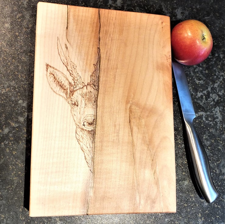 This lovely piece of sycamore has a pyrographed deer peeking out from behind the tree. The grain and colour have been used to enhance the design. This chopping / serving board is more a piece of art than a kitchen utensile. The deer is burned into the surface using the colour and grain in the design..