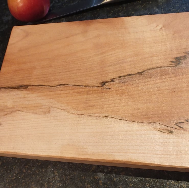 The board is a beautiful piece of coloured and quilted sycamore, sycamore is naturally anti bacterial and is ideal for food items, it has been finished with a food safe chopping board oil. It measures approx. 10 inches x 7 inches x 1 inch a useful size that is a joy to handle.