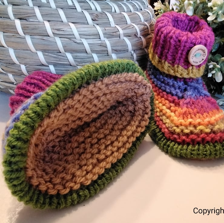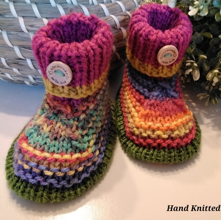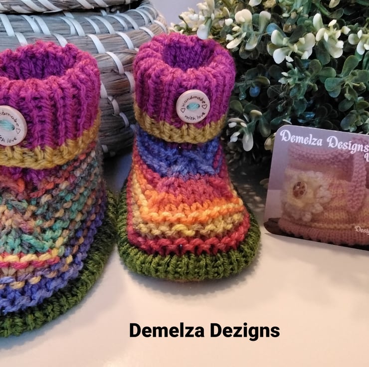 A sweet practical pair of cosy warm booties ideal for everyday wear when out and about in the stroller or car seat or in the home. They have been lovingly designed and hand crafted using quality branded British premium machine washable yarns. The sole edging has a defined piped edges. On the front turn down cuff is a genuine wooden button with a sweet sentiment burnt etched on them.