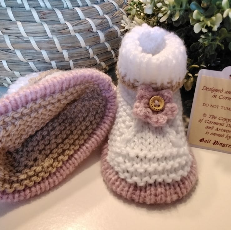 A sweet practical pair of cosy warm booties ideal for everyday wear when out and about in the stroller or car seat. They have been lovingly designed and hand crafted using quality branded British premium machine washable yarns containing. The sole edging has a defined piped edges with a hand crocheted flower in the centre with a genuine wooden button.