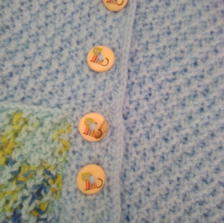 Practical and warm hand knitted hooded jacket in pale blue and a variegate blue double knitting yarn. The hooded jacket is in stock, in the colours shown, and it has been made to fit a 0 - 6 month old baby with a chest size of 16 inches. It would make an ideal gift for a baby shower,for a new baby or for you own little ones to keep them snug and cosy this winter. It can be made for you in a size and colour of your choice. Available sizes are shown below and please state colour required when you order. The processing time will be between 1 and 2 weeks to produce and post to you.