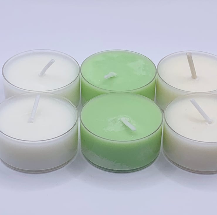 Please note colours may vary due to lighting and photography. There may be some frosting on top of the tealight, this is perfectly normal and a natural property of soy wax when cooling.