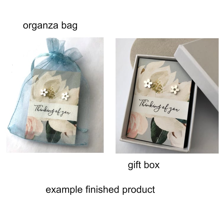 Our earrings come with a gift card and an organza bag and if you want, upgrade to a white gift box.