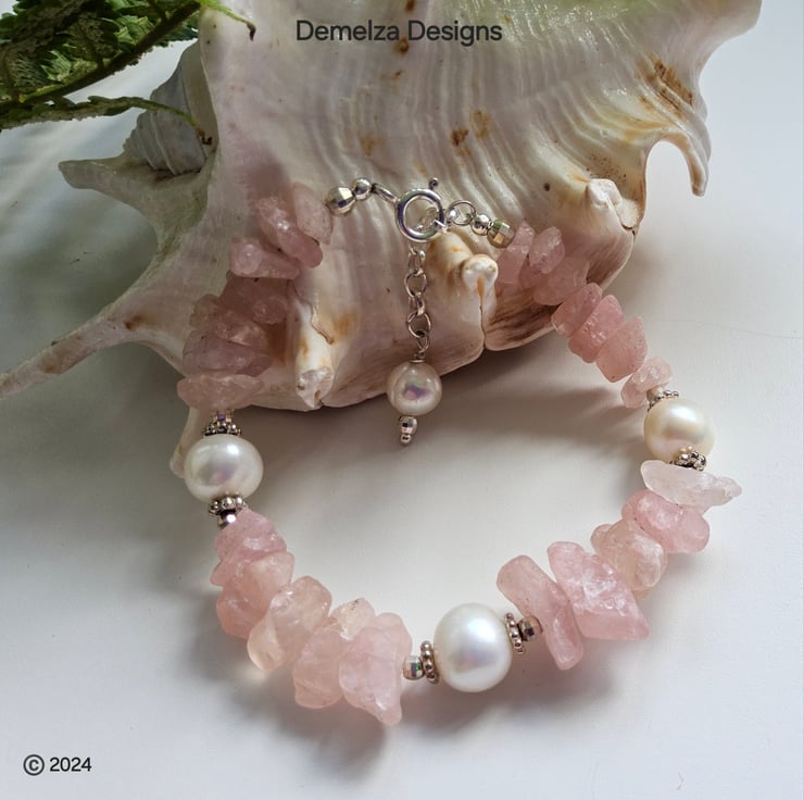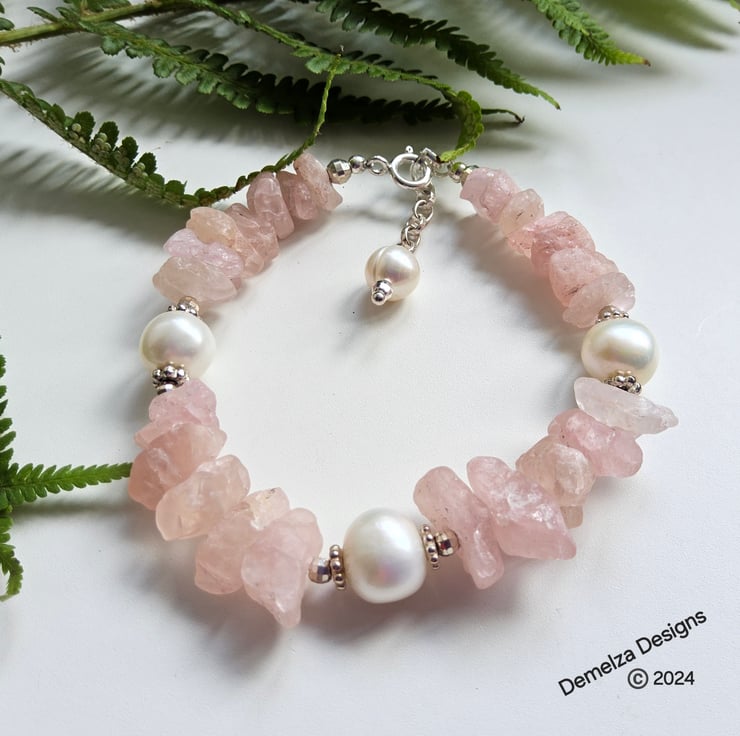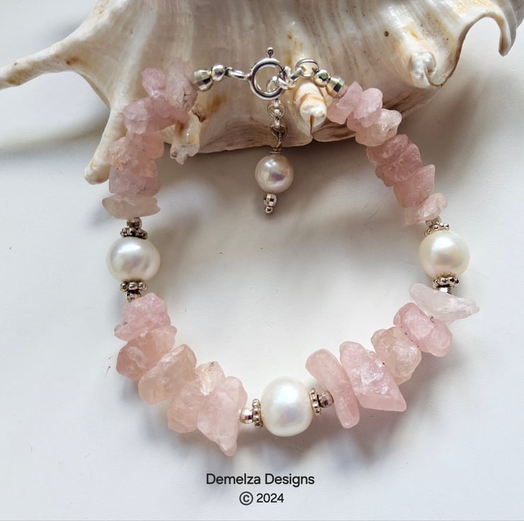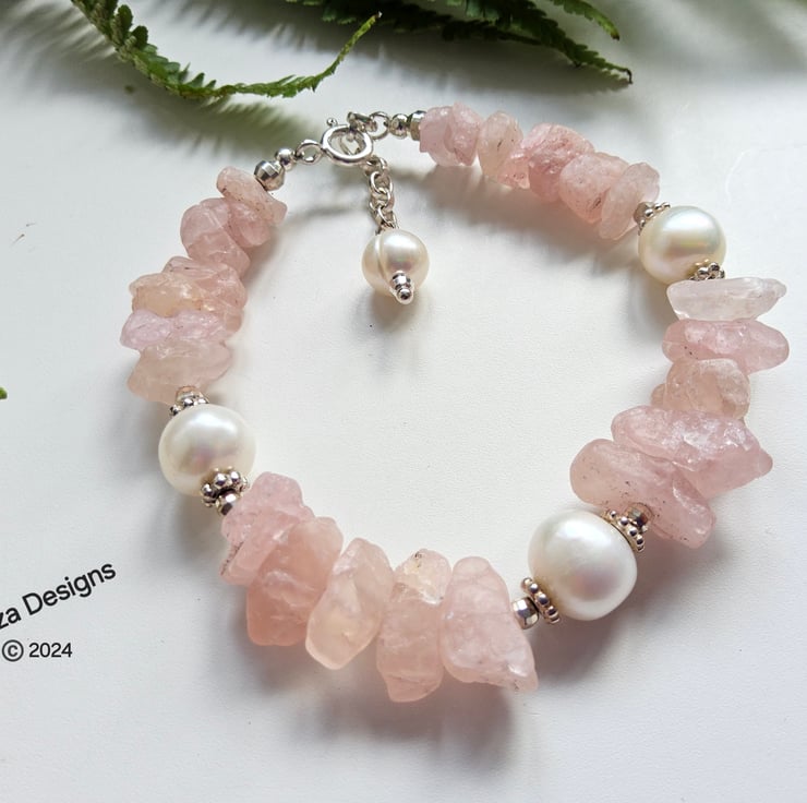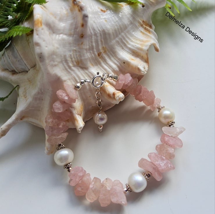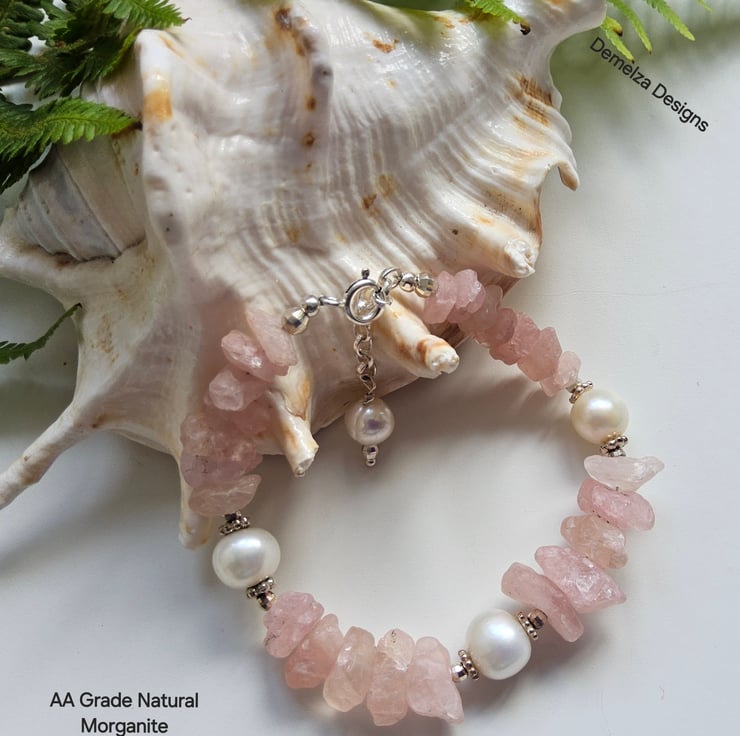 This beautiful natural untreated morganite bracelet totalling 71.22ct in weight has been lovingly designed and hand crafted in Cornwall. The raw morganite natural stone properties display outstanding colour and rarely available to purchase within the trade. Between them are 10-12mm quality freshwater culture pearls with sterling silver daisy design flat spacer beads and 3mm faceted sterling silver spacer beads either side of the pearls. This provides an opulent, sophisticated look to the finished product to adorn any ladies wrist.
