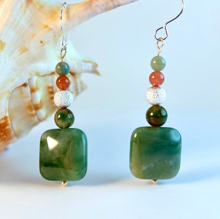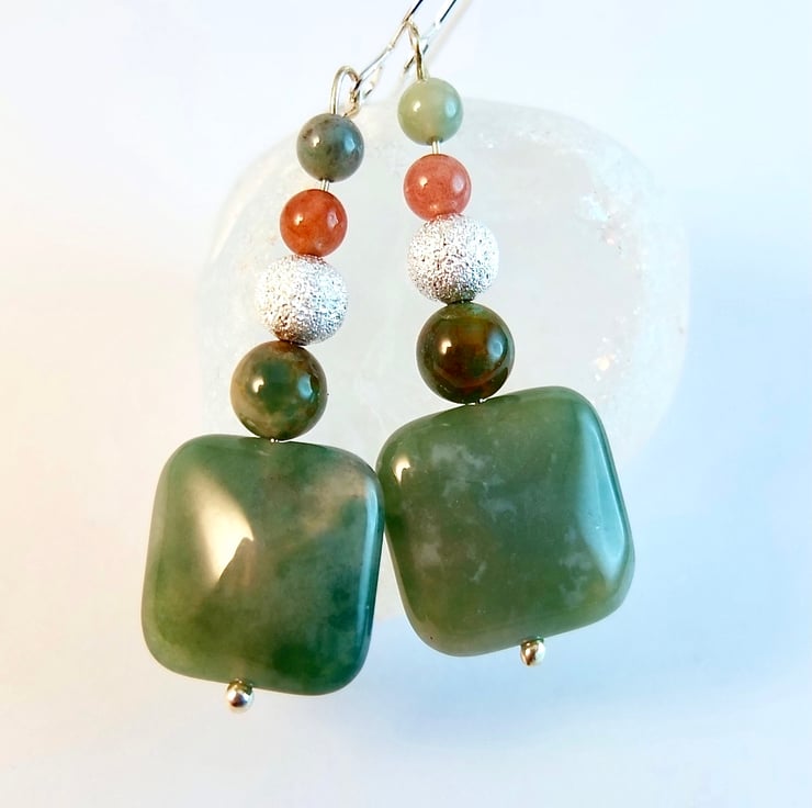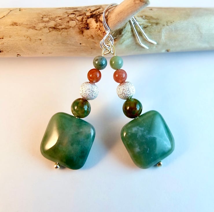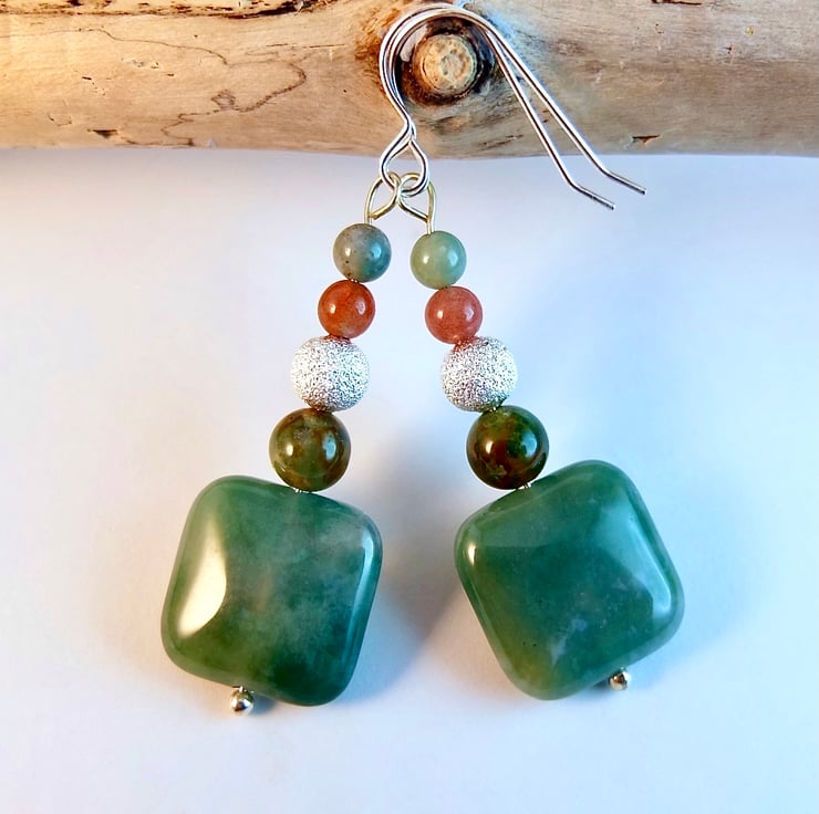Here I have used 16mm squares of sage green marbled with mint, 6mm forest green with russet patches, 4mm dusky pink and 4mm light sage green beads.