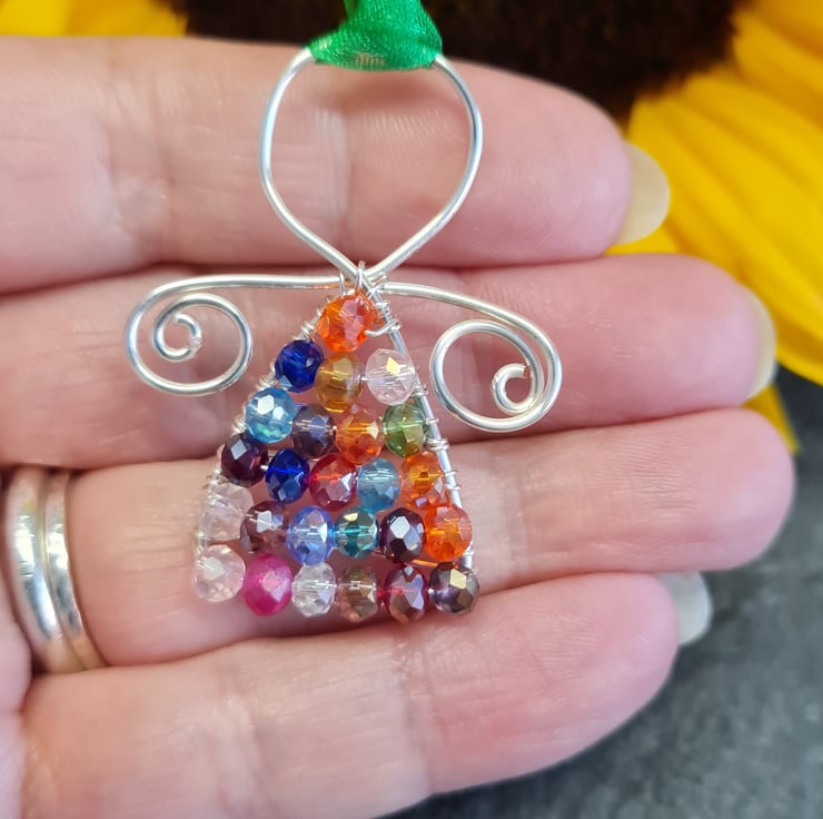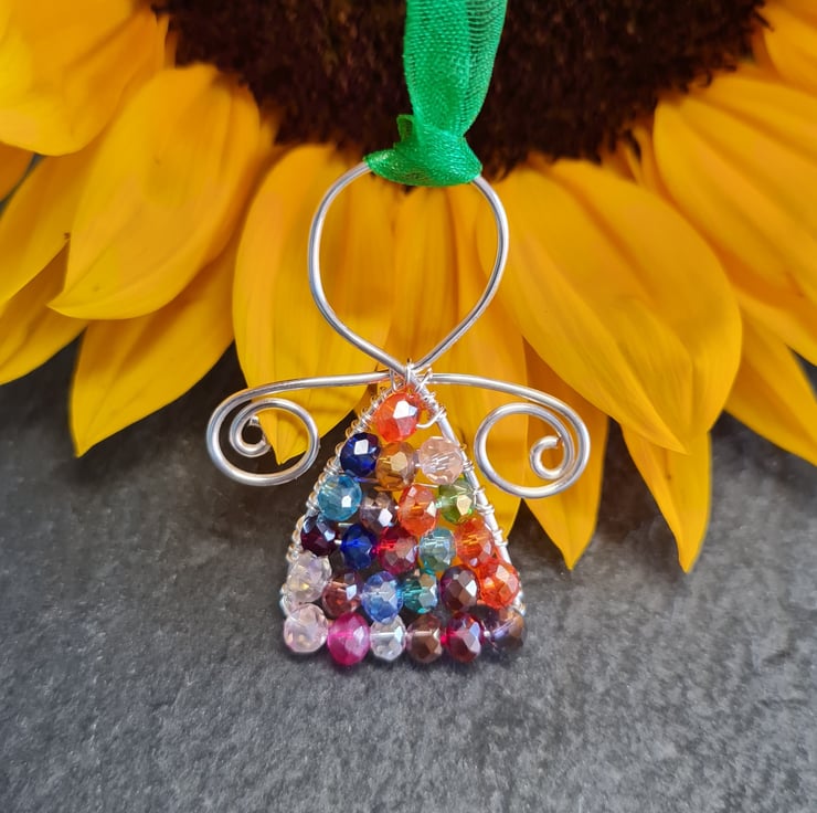 Wire wrapped mini angel with mixed colour crystals with an ab coating that ensures that they catch the light beautifully.