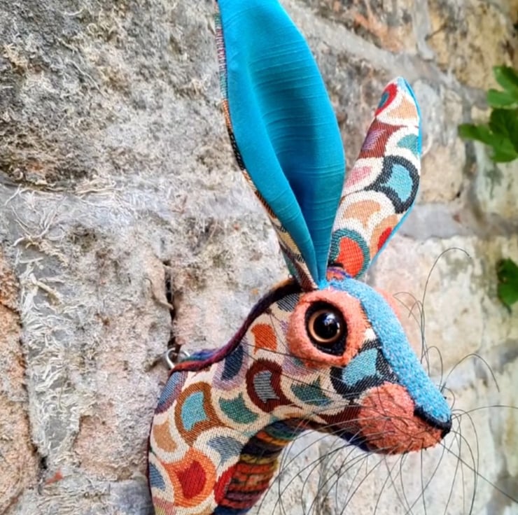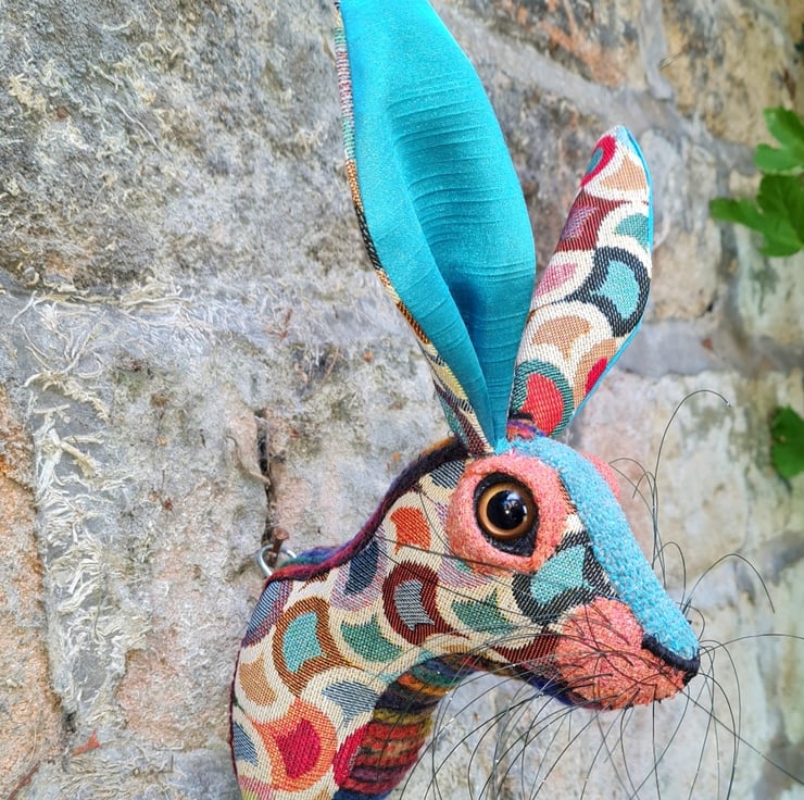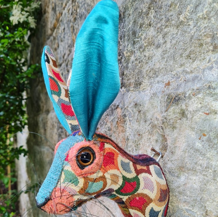 A lifesize faux hare which I have handmade and covered in hand stitched turquoise and multi coloured fabric. The head is backed with felt and has a metal hanger to hang it on the wall. It is lightweight.