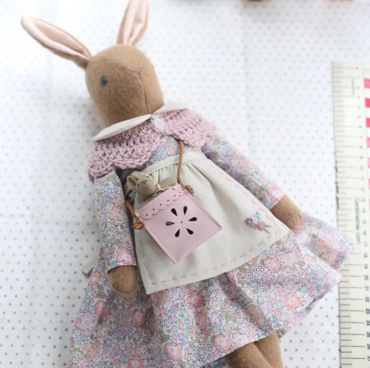 Her accessories include a tiny leather bag, hand punched with a daisy design and containing a baby bunny with a ric rac tie.