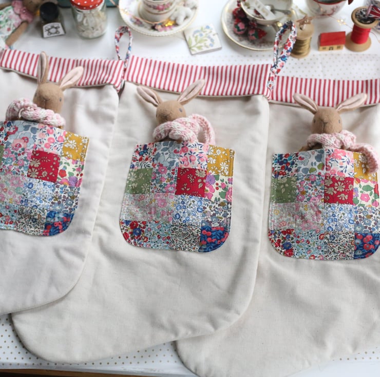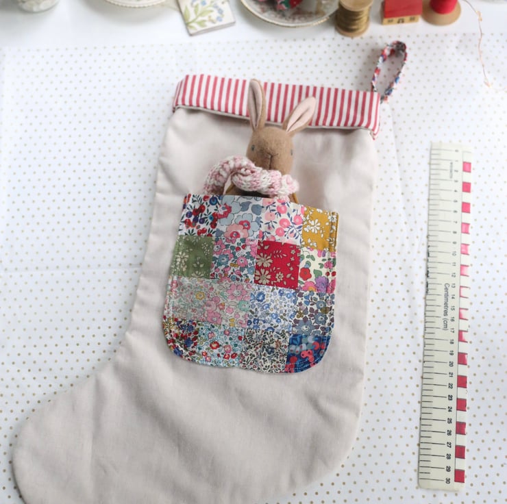 Each stocking is made from Robert Kaufman Essex Linen and is lined with a red pinstripe ticking fabric. The patchwork pockets are made from a variety of beautiful Liberty of London Tana Lawn fabrics including, Capel, Wiltshire and Betsy.
