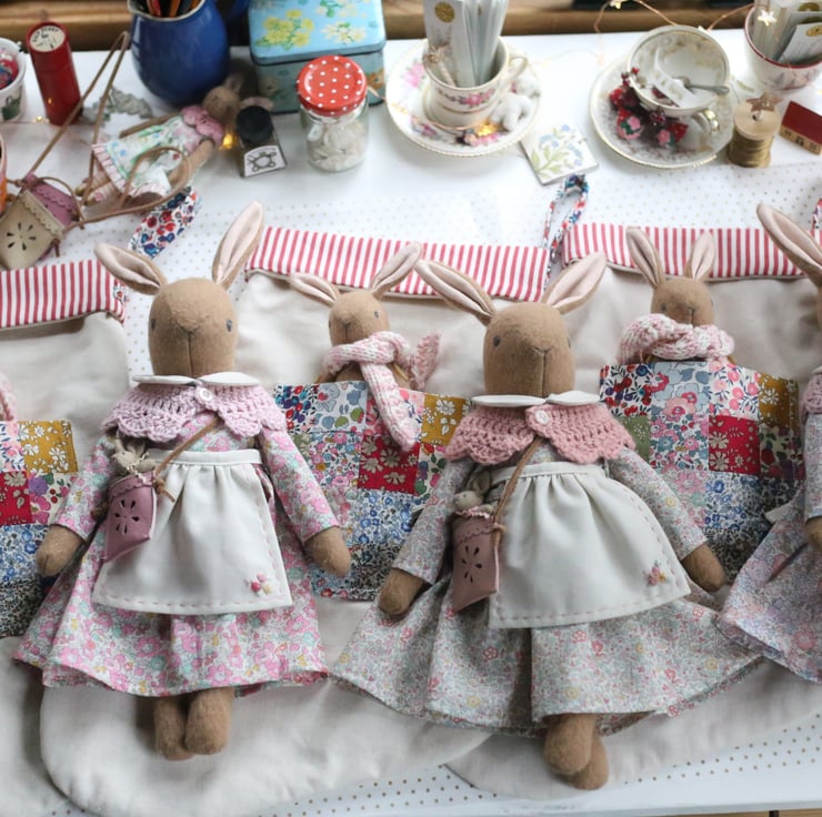 Each stocking contains a tiny baby bunny made from brown cashmere/ wool mix fabric. Their arms are attached with buttons and they wear a hand knitted stripe scarf made from Rowan yarn.