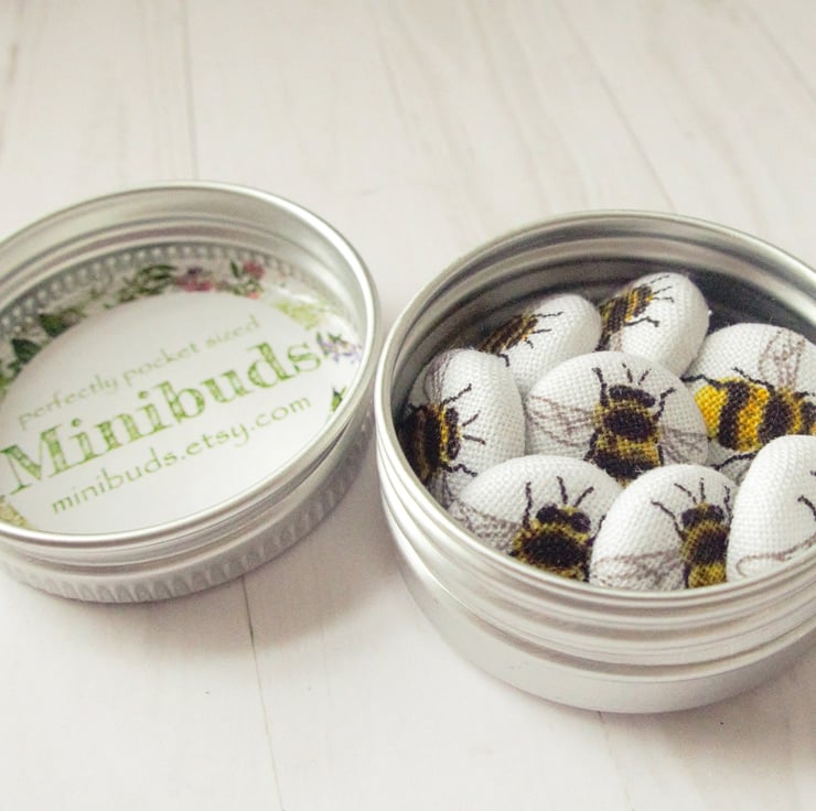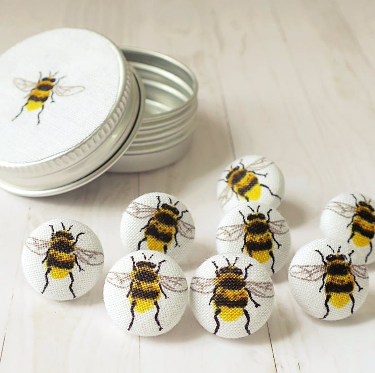 Bee magnets or pins handmade in the UK. Set of 8 x 15mm fabric button bees in a matching gift tin with screw top lid. Perfectly pocket sized and easy to post as large letter sized box with a card.