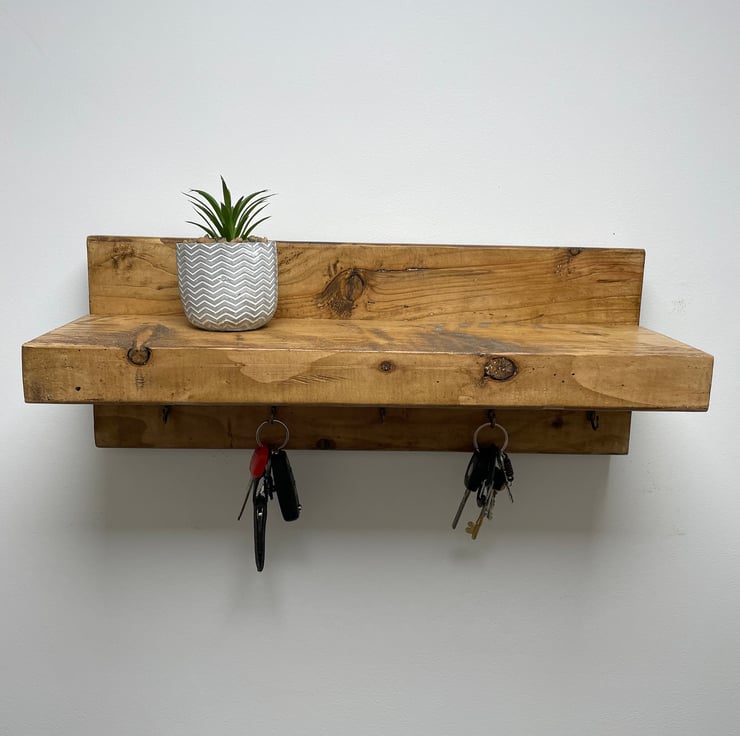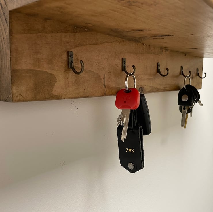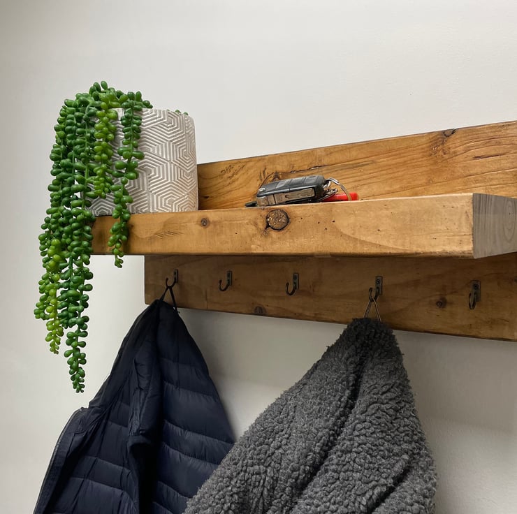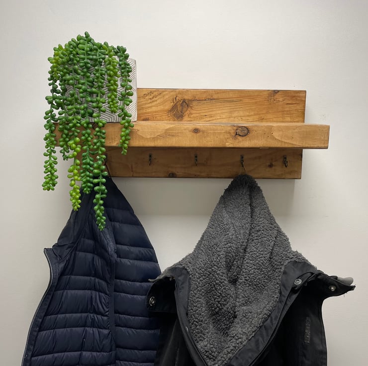 Our new coat rack with included storage shelf is perfect for handing coats, keys and even a plant on top! This stunning item is perfect for any room in the house!