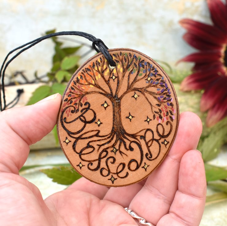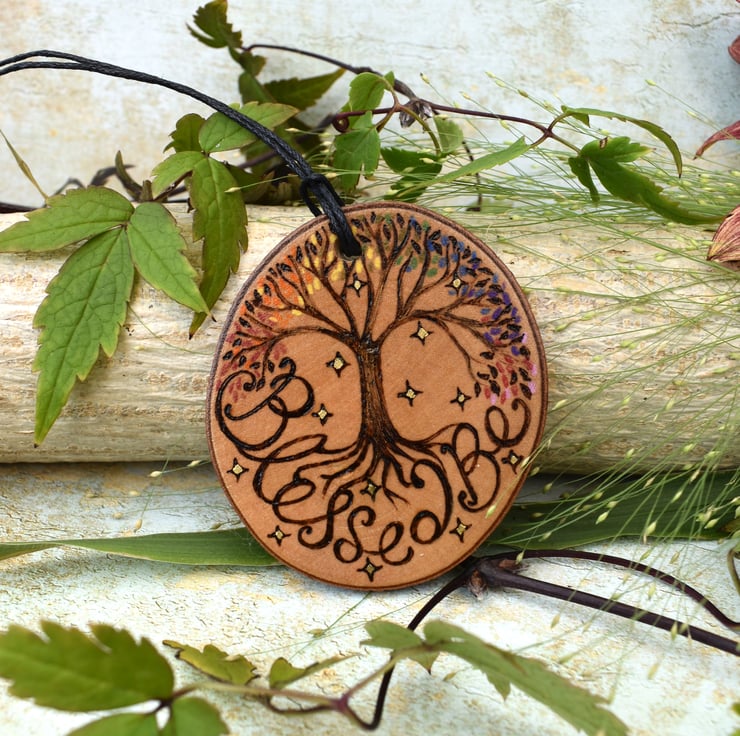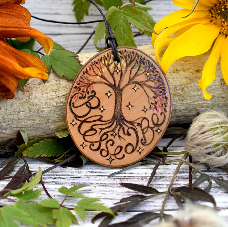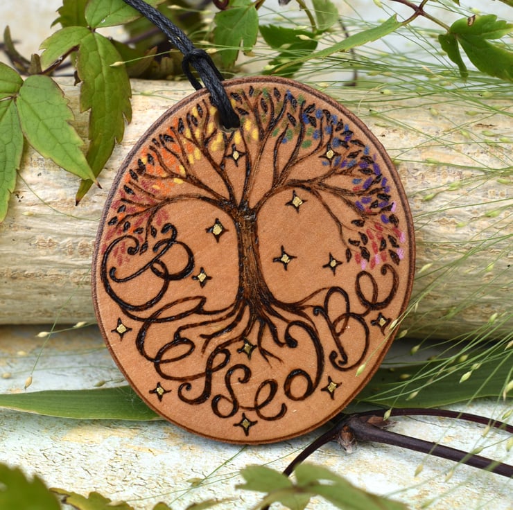 A tree of life style design, with a rainbow of leaves adorns this wood slice, with the words 'blessed be'. Burned by hand using pyrography and coloured using art pencils. Ideal for Christmas, Yule or all year round.
