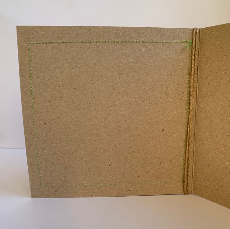 The hessian is machine stitched, using a contrasting thread, onto a plain brown recycled card. This stitching is visible on the inside of the card.