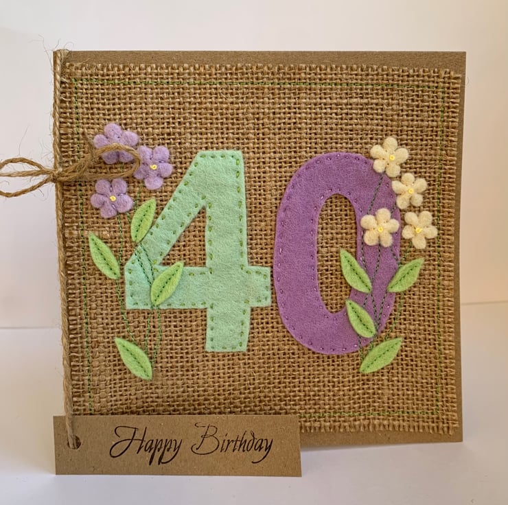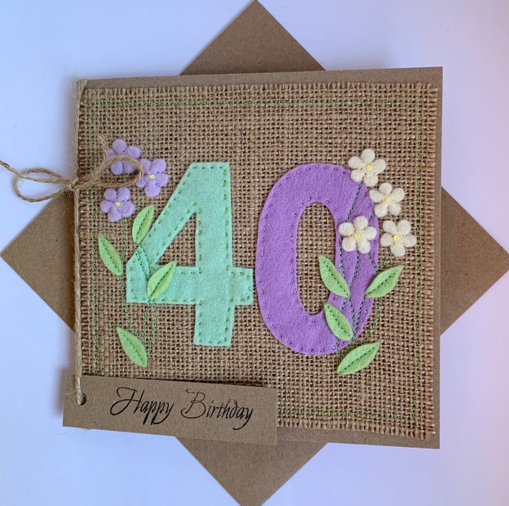 A unique handmade card for a special birthday. The numbers for this 40th birthday card are hand cut from pale green and lilac acrylic felt and hand sewn to a hessian background. Flowers, hand cut from wool felt, in contrasting colours are added to decorate the card.