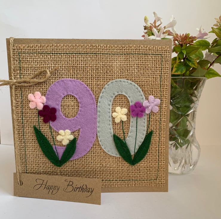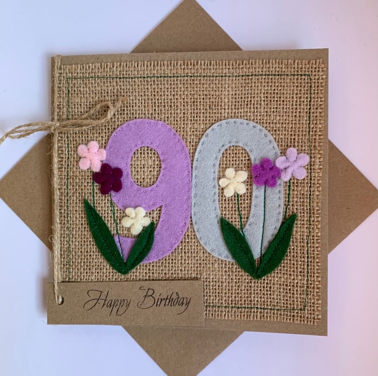 A unique handmade card for a special birthday. The numbers for this 90th birthday are hand cut from pale grey and lilac acrylic felt and hand sewn to a hessian background. Flowers, hand cut from wool felt, in pinks, purples and cream are added to decorate the card.