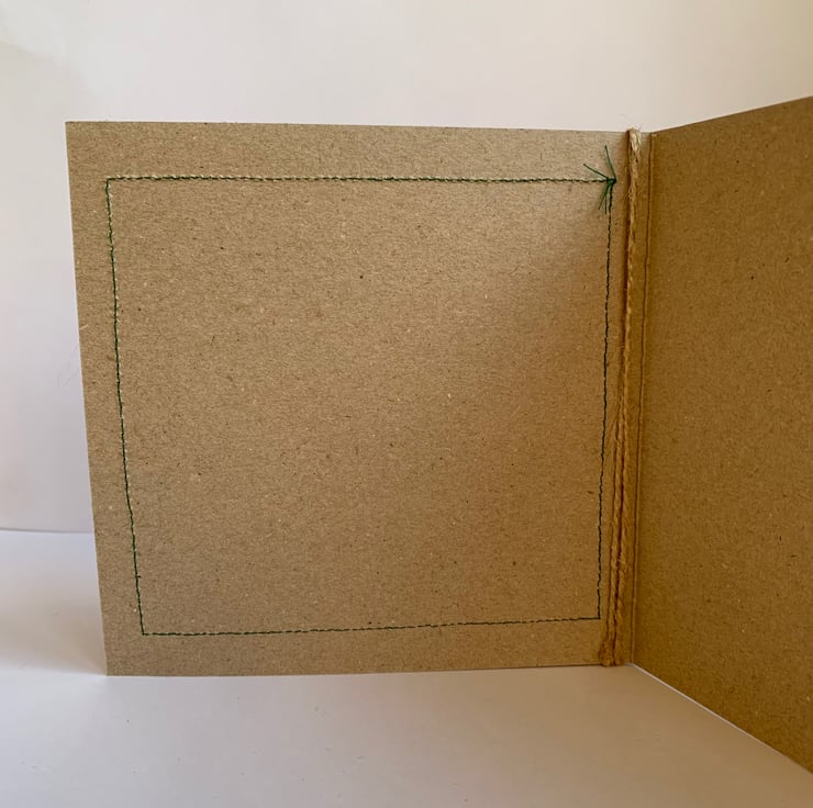 The hessian is machine stitched, using a contrasting thread, onto a plain brown recycled card. This stitching is visible on the inside of the card.