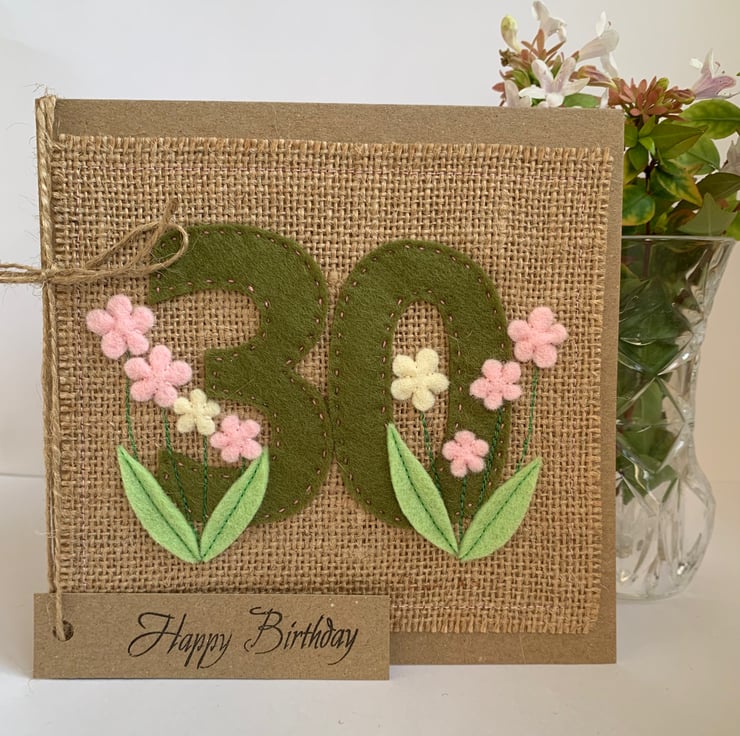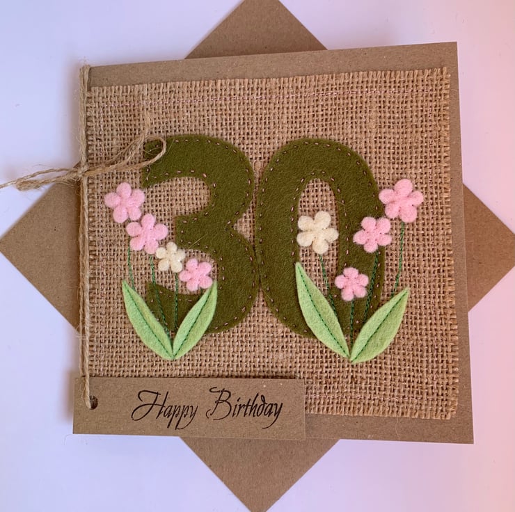 A unique handmade card for a special birthday. The numbers for this 30th birthday card are hand cut from moss green acrylic felt and hand sewn with pink thread to a hessian background. Flowers, hand cut from wool felt, in pale pink and cream are added to decorate the card.