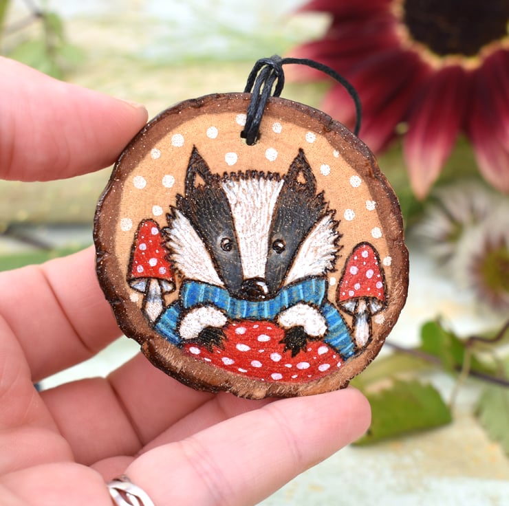 A cute badger, surrounded by toadstools adorns this festive tree slice Christmas tree decoration. Burned by hand using pyrography and coloured using art pencils.