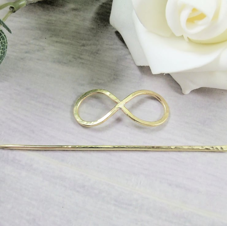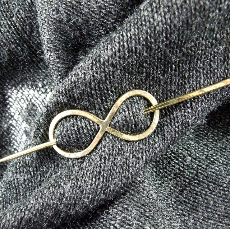 The infinity knot shape is hand forged from 2mm solid brass wire with hammered texture. The the pin is also made from 2mm wire, shaped with a rounded blunt point and a paddle shape at the other.