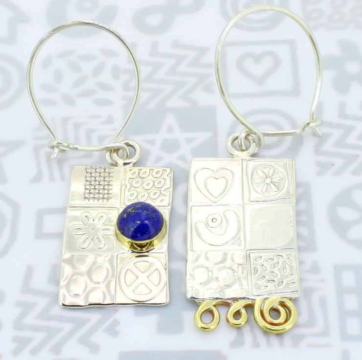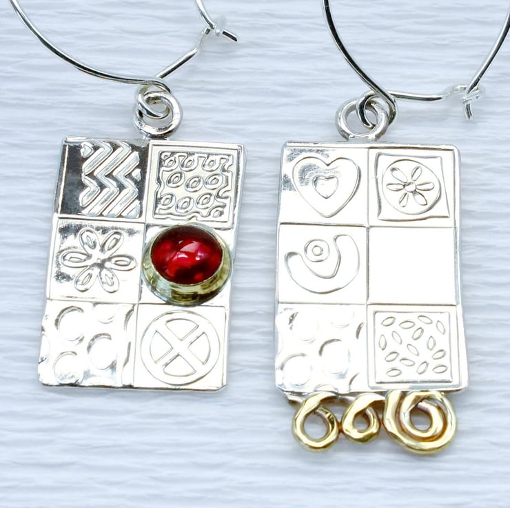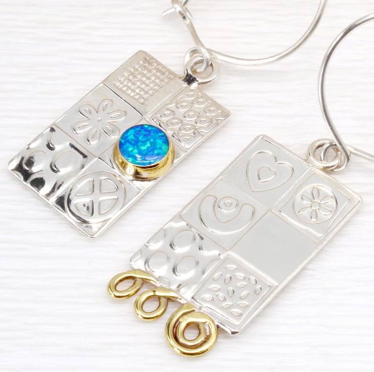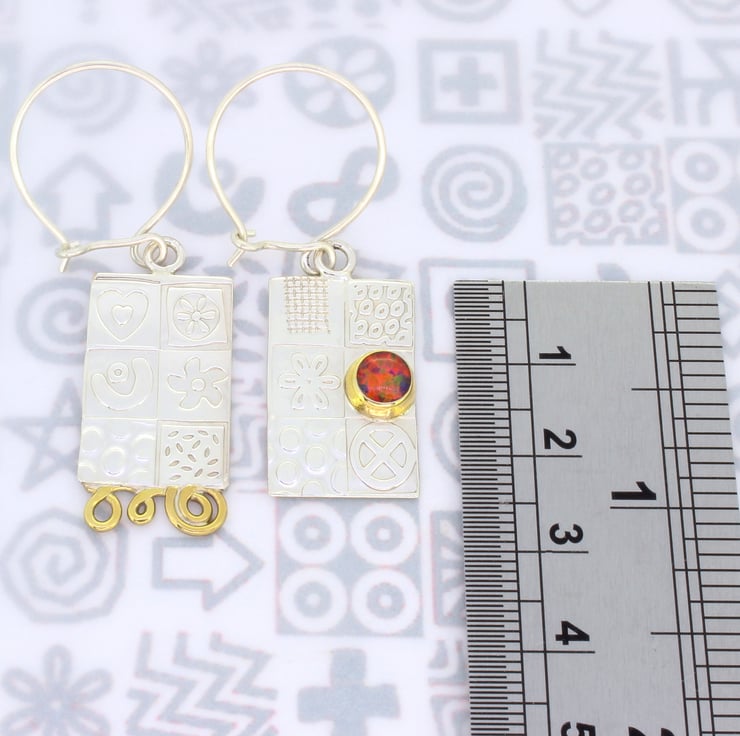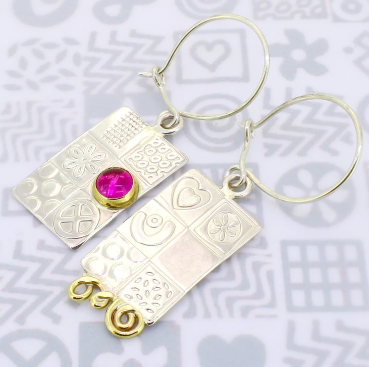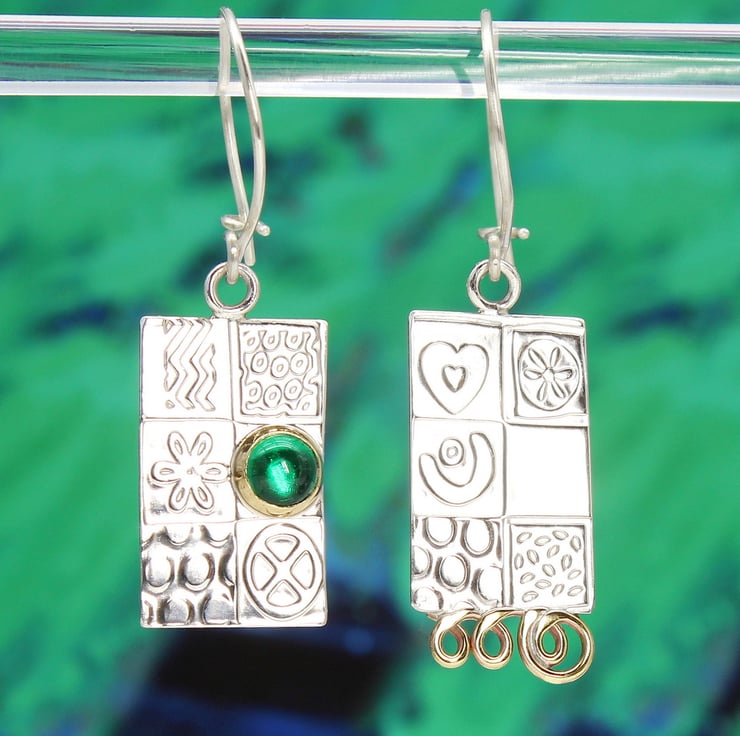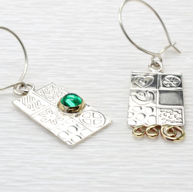 We designed and handmade these contemporary earrings in our workshop in Yorkshire. They are made from sterling silver with brass decoration and we offer a choice of gemstones, this particular pair features one of our wonderful lab. grown 6mm green spinel gemstones. These earrings measure 22mm x 15mm and have a total drop length of 45mm including the sterling silver ear wires.