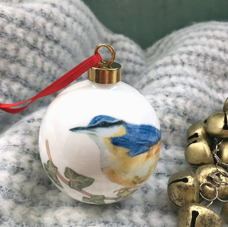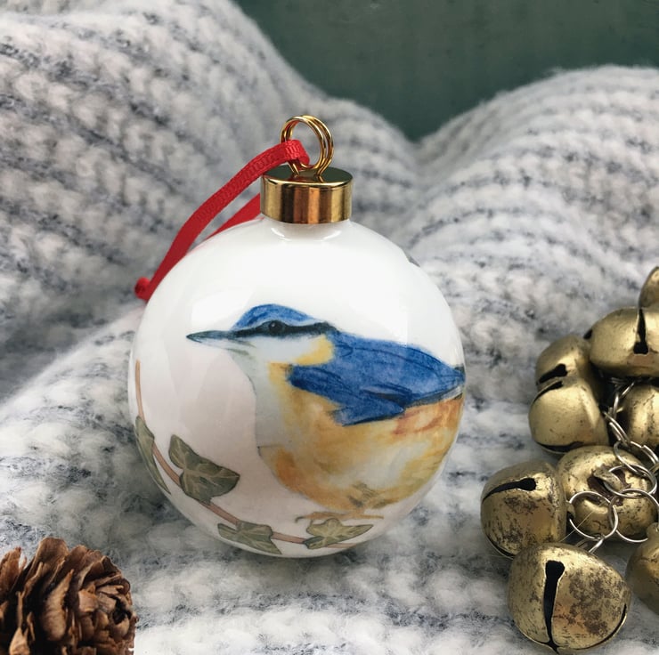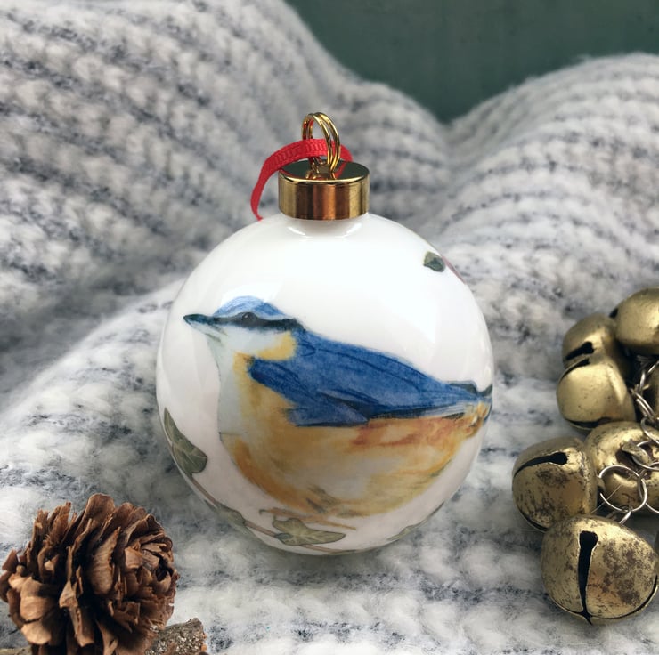 Hand decorated fine bone china Christmas bauble with my watercolour nuthatch illustration. A beautiful heirloom Christmas decoration.
