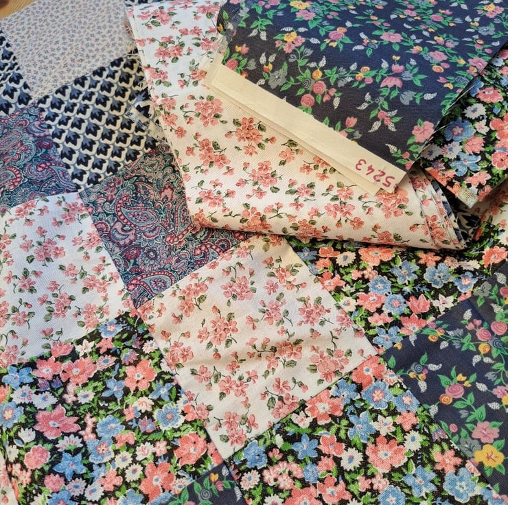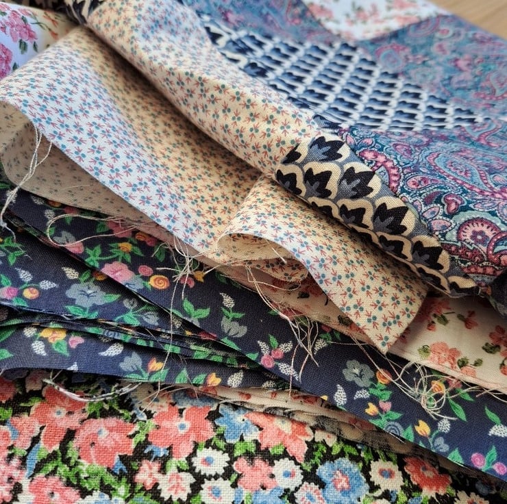 The partially-pieced fragment is 87cm by 55 cm and then there are 13 nice big pieces of additional fabric, mainly cut in 12 cm wide strips. Lovely quality cotton fabrics in blues, pinks and creams.