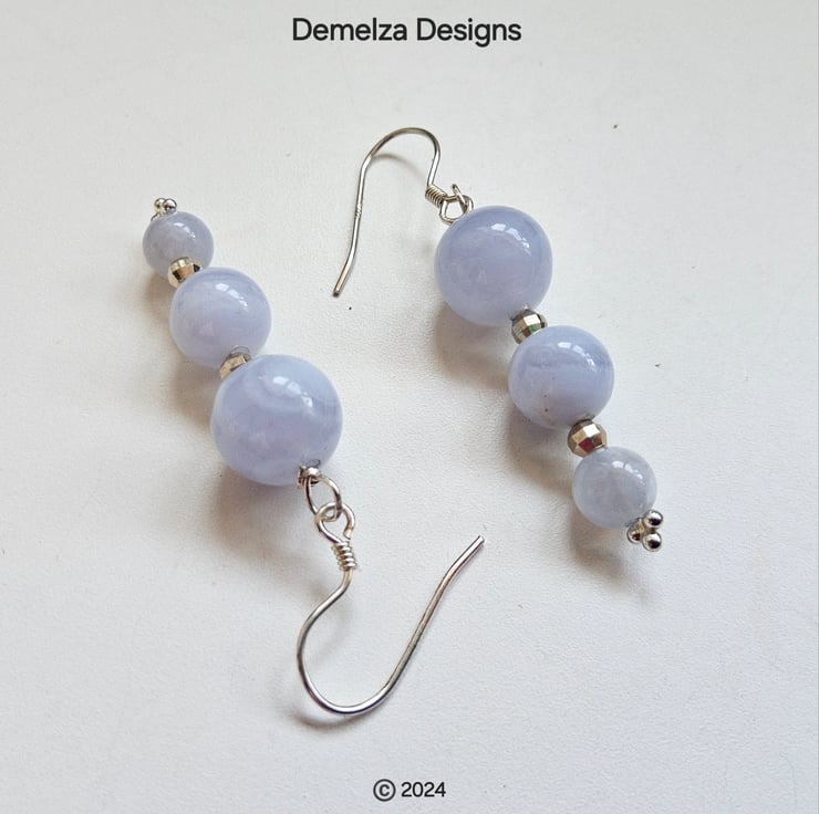 The 10mm, 8mm and 4mm smooth polished natural untreated round gemstones graduatei in size from top to bottom. They all have strong colour with well defined blue lace agate markings totalling 22.95cts in weight. Between the rounds are 3mm faceted sterling silver beads adding sparkle during movement when worn. All other components are 925 sterling silver which is classified as a precious metal and nickel free.