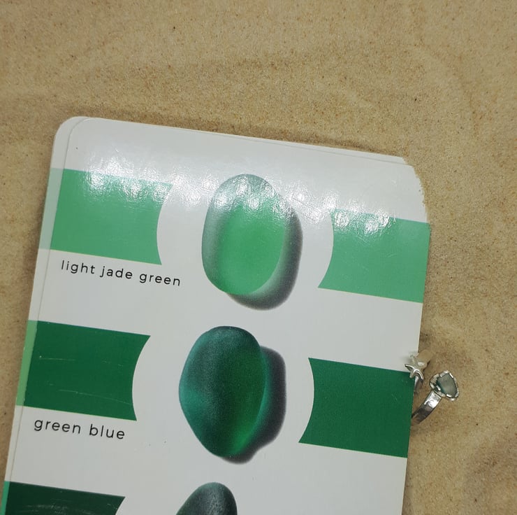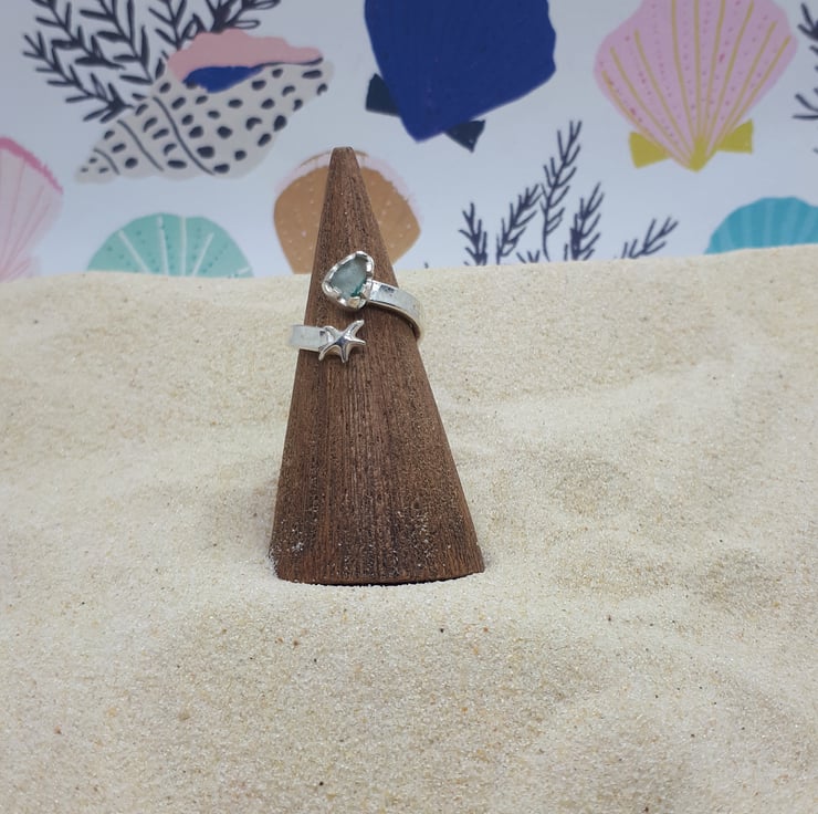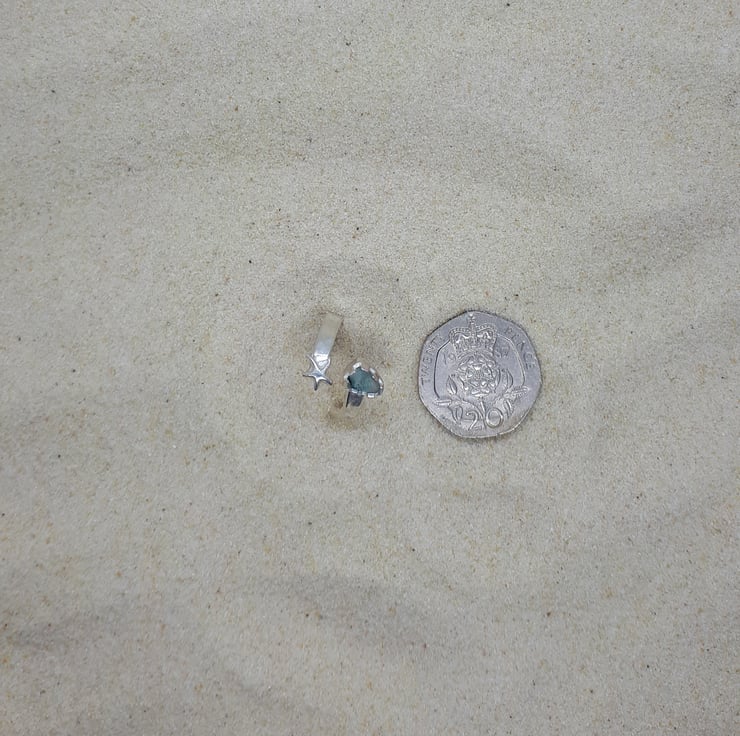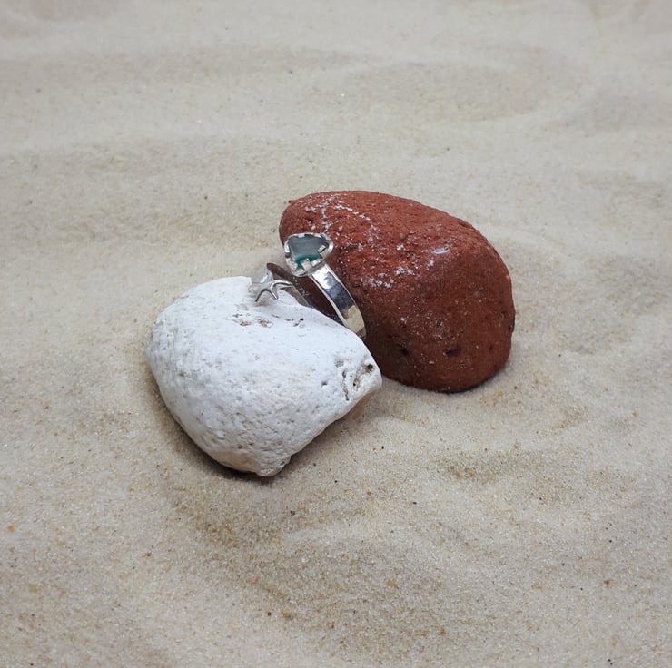 A genuine piece of UK sea glass (green and white) set in fine silver bezel on a hammered sterling silver band with a fine silver starfish.