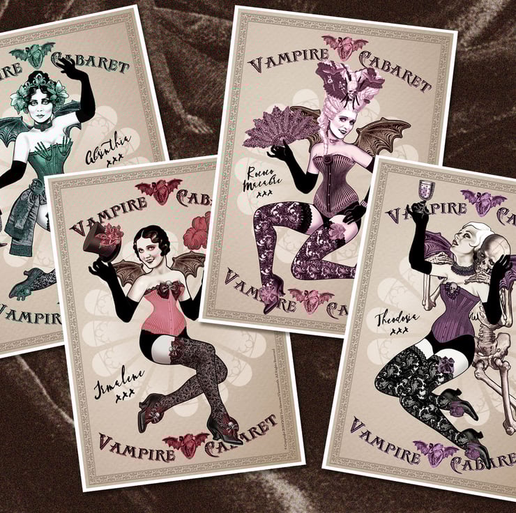 My showgirls - and other members of 'Weirdly Nightshade's Vampire Cabaret' - first appeared as paper dolls back in 2008! See, almost as old as time itself ;o) Now the cast are immortalised (they're already immortal obviously, but you know what I mean) as flat prints, *signed by each star, ready for you to frame and hang on your wall.