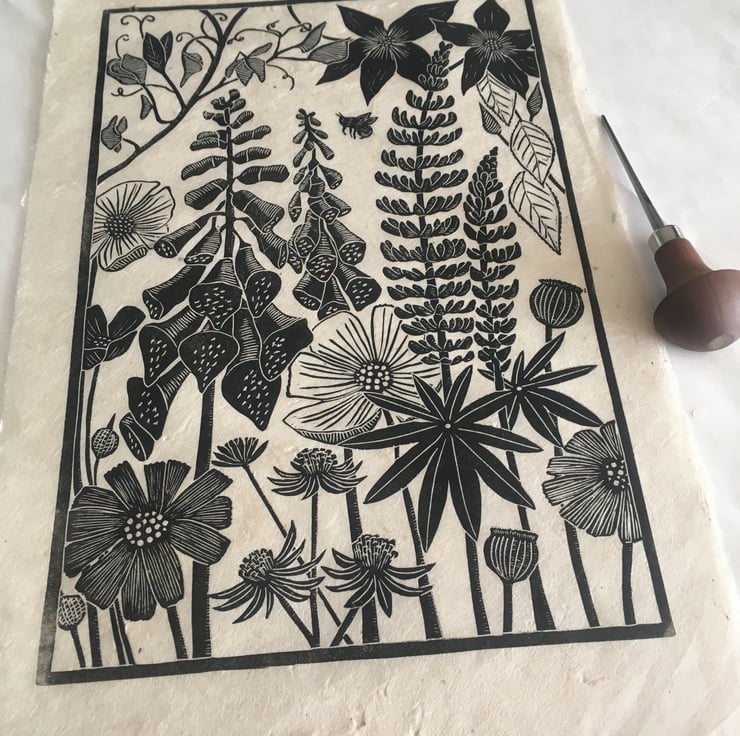 I have wanted to create a print featuring my favourite cottage garden flowers all together for such a long time and I have finally done it! "Border Force" features sweet peas, lupins, foxgloves, clematis, poppies, daisies and astrantia with a little bumble bee.
