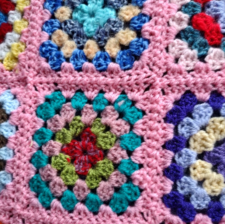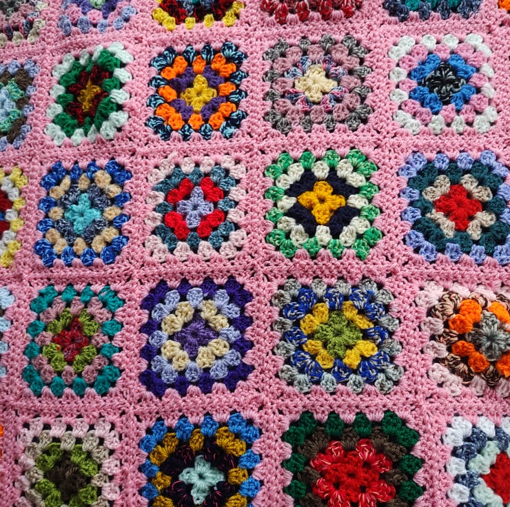 I have made several crotched woollen blankets, this one has a pink surround to each square. There are 63 squares (9 x 7) in total. The size is 38" x 30".