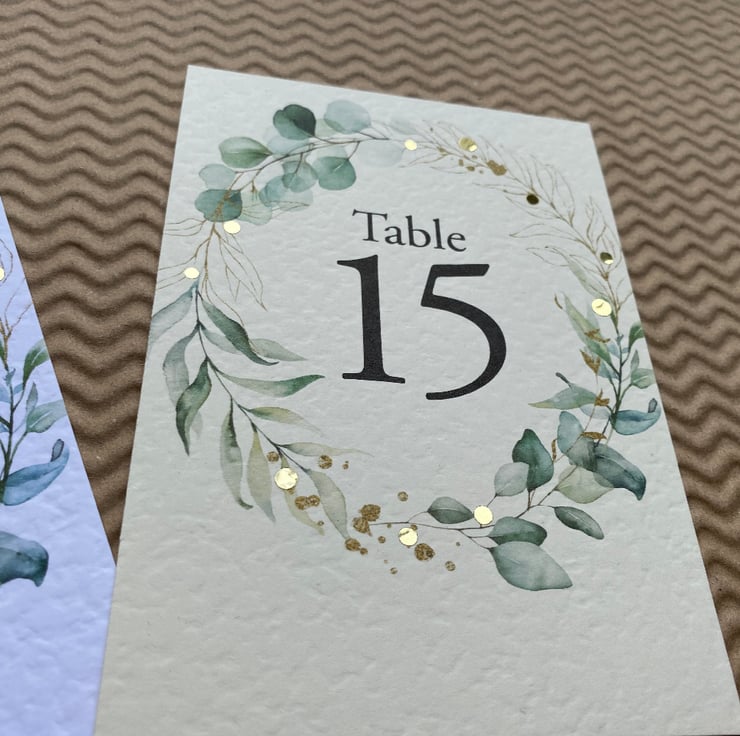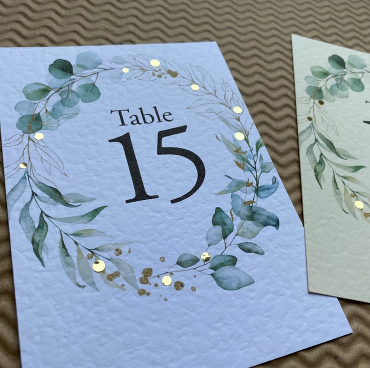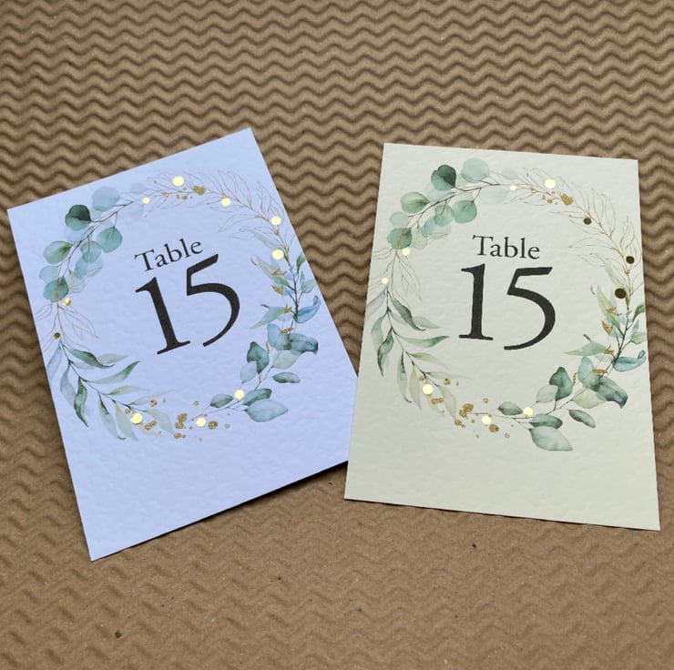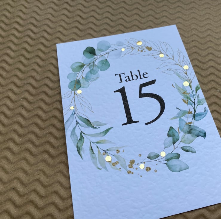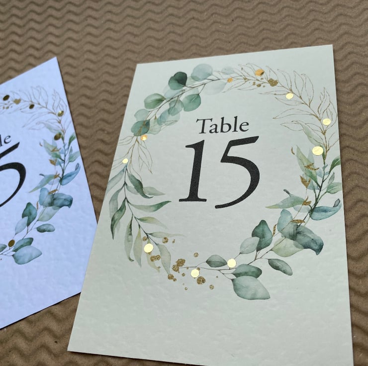 WEDDING table numbers, printed on A6 size cards. Eucalyptus foliage wreath, greenery, golden leaves outlines, rustic wedding theme design.