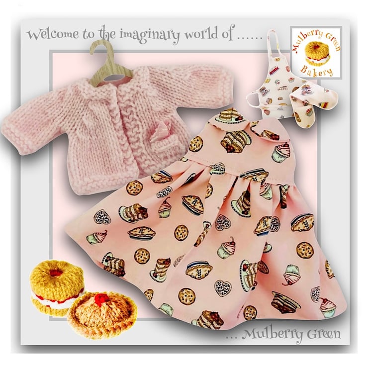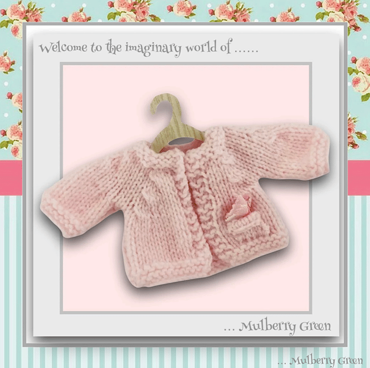 A sweet little pale pink cardigan with the tiniest pocket handkerchief in the tiniest of pockets, to fit the Mulberry Green characters. The cardigan is hand knitted and looks lovely with the dresses in my shop.