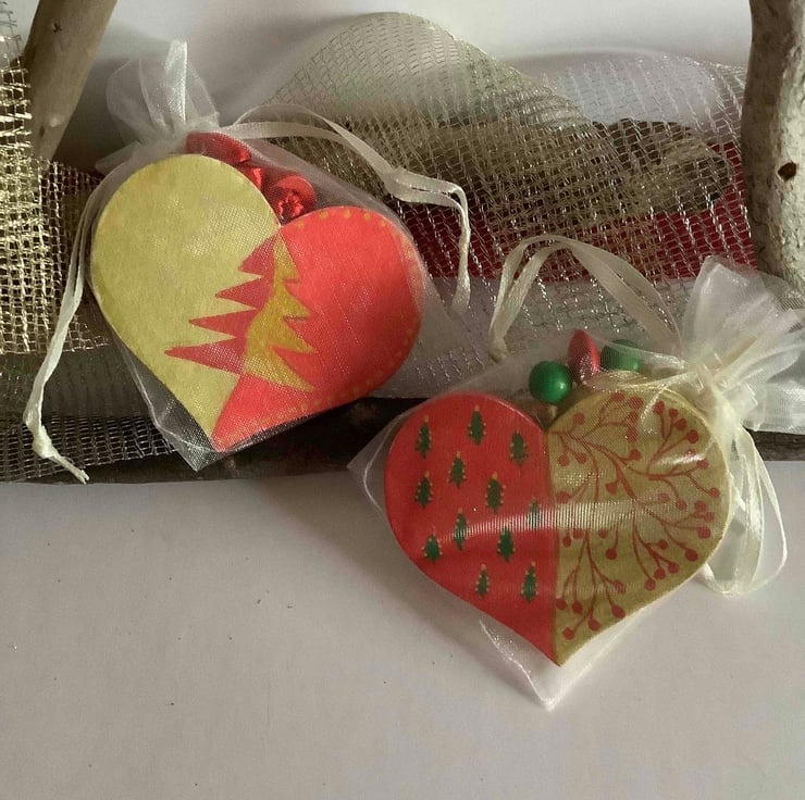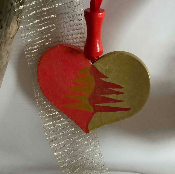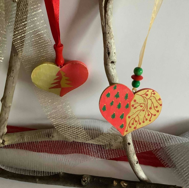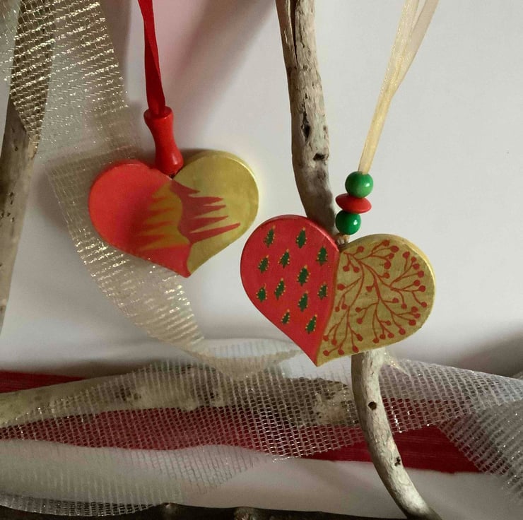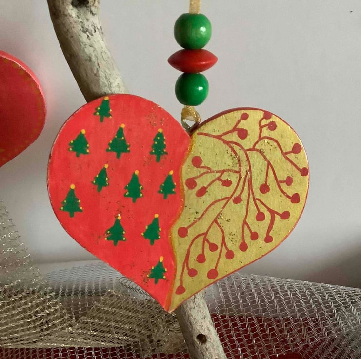 One of the hearts is painted in red and gold with designs of Christmas trees and red berries on both sides. This heart hangs by a slim gold organza ribbon attaching are 3 wooden beads. One red bead and 2 green beads. A little sparkle has been added.