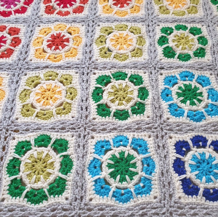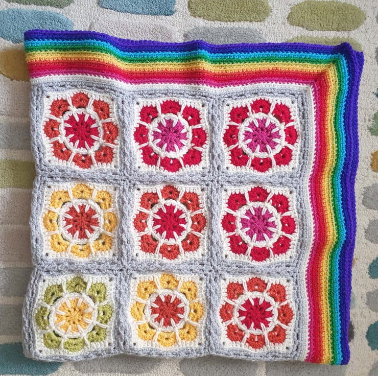 The design is the lovely Magic Rainbow Baby Blanket by Tamara Kelly https://www.mooglyblog.com/magic-rainbow-baby-blanket/