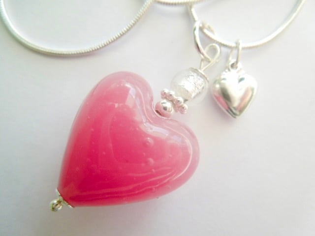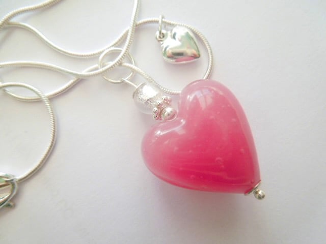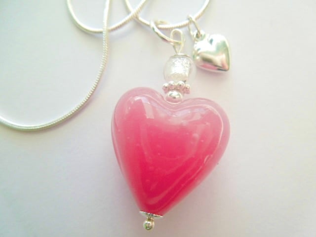 A beautiful Murano glass heart pendant with a soft pink opaque Murano glass heart bead (20mm) with a pure silver foiled small silver Murano glass round bead and sterling silver daisy spacer bead. The pendant has a tiny sterling silver puffed heart charm and hangs from a sterling silver snake chain (18ins). The heart bead is beautiful and a very soft, pretty shade of pink which is enhanced by the silver beads and heart charm and is presented in a pretty gift pouch. It will be shipped with track and sign delivery.