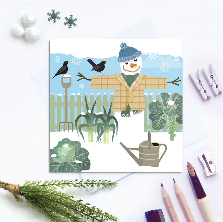 Winter Allotment Christmas gift wrap featuring a snowman scarecrow, blackbirds and a whole patch of winter vegetables including sprouts! Premium, eco friendly, matt gift wrap sure to make any Christmas gift look amazing - a great choice for a more sustainable, eco friendly Christmas.
