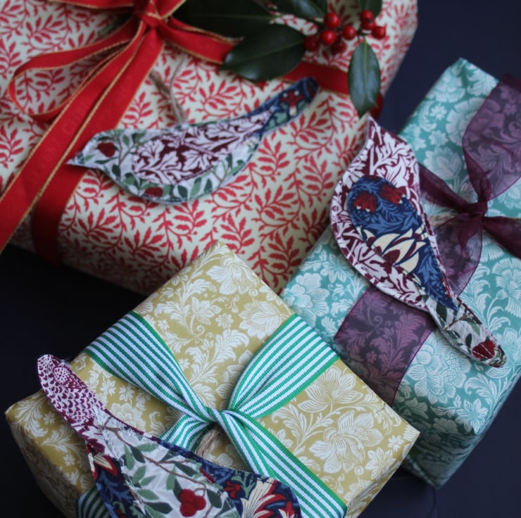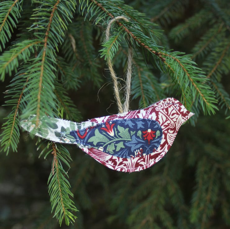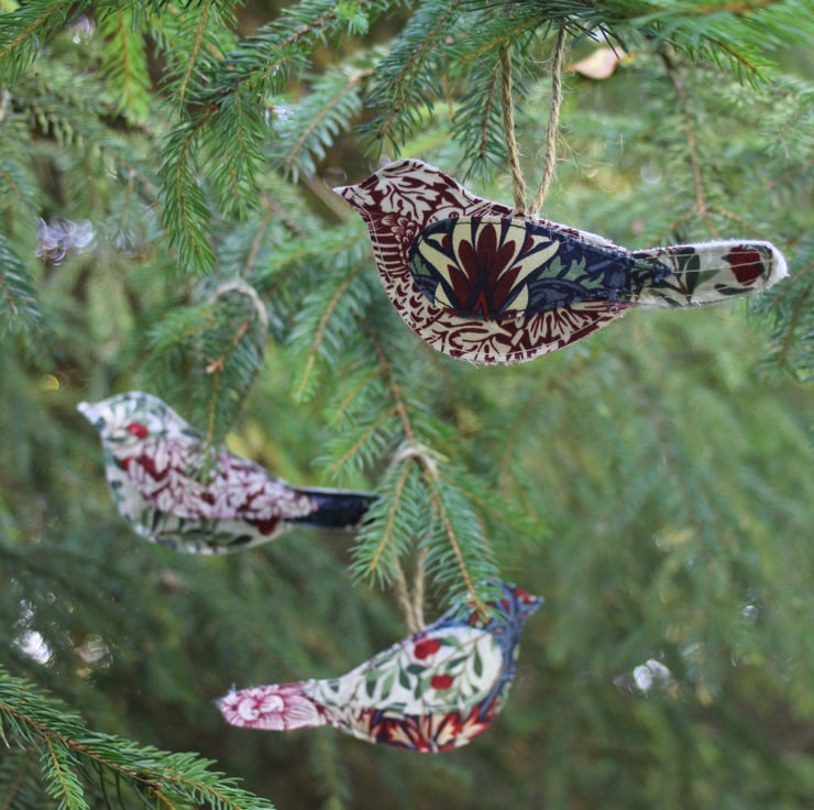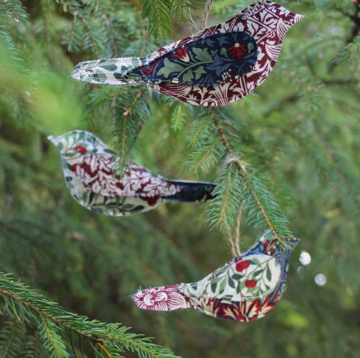 A set of three lightly padded hanging bird decorations made from oddments of V&A William Morris 'Winter Berry' fabric