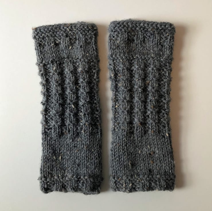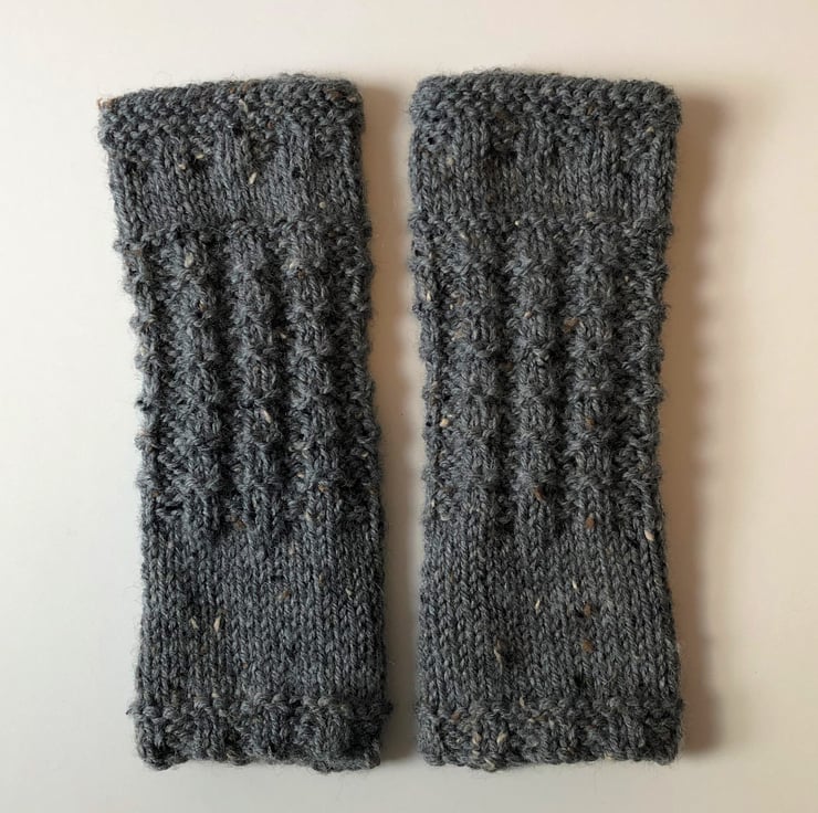 These grey tweed soft fingerless mittens / wrist warmers / gloves are knitted with a pretty waffle pattern. They are made from 25% Aran tweed wool with little flecks of cream, brown and black and are 8 inches long.