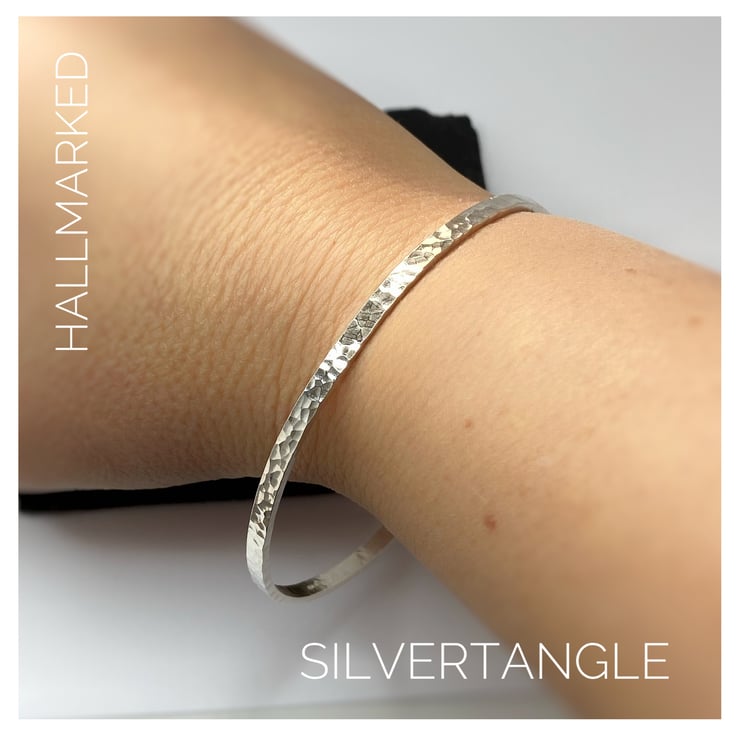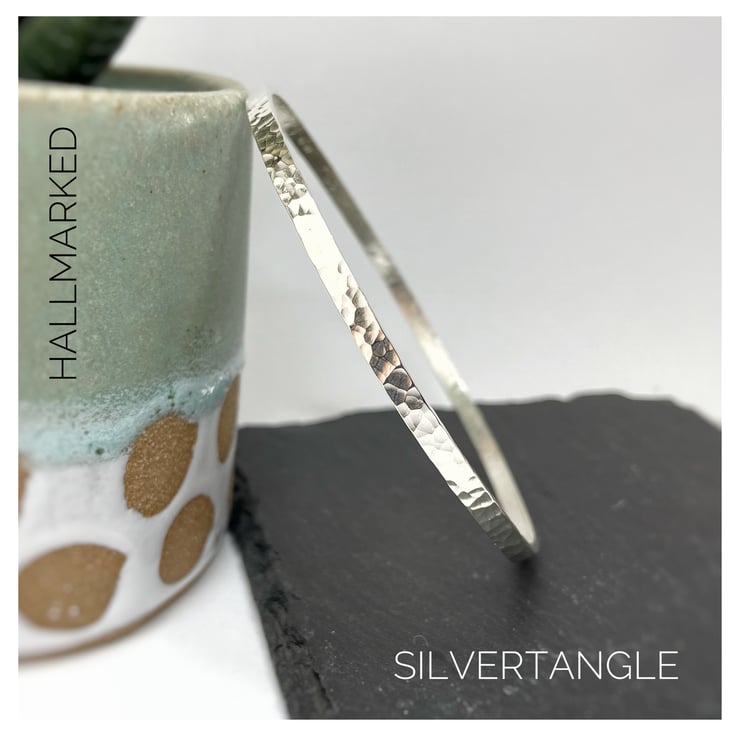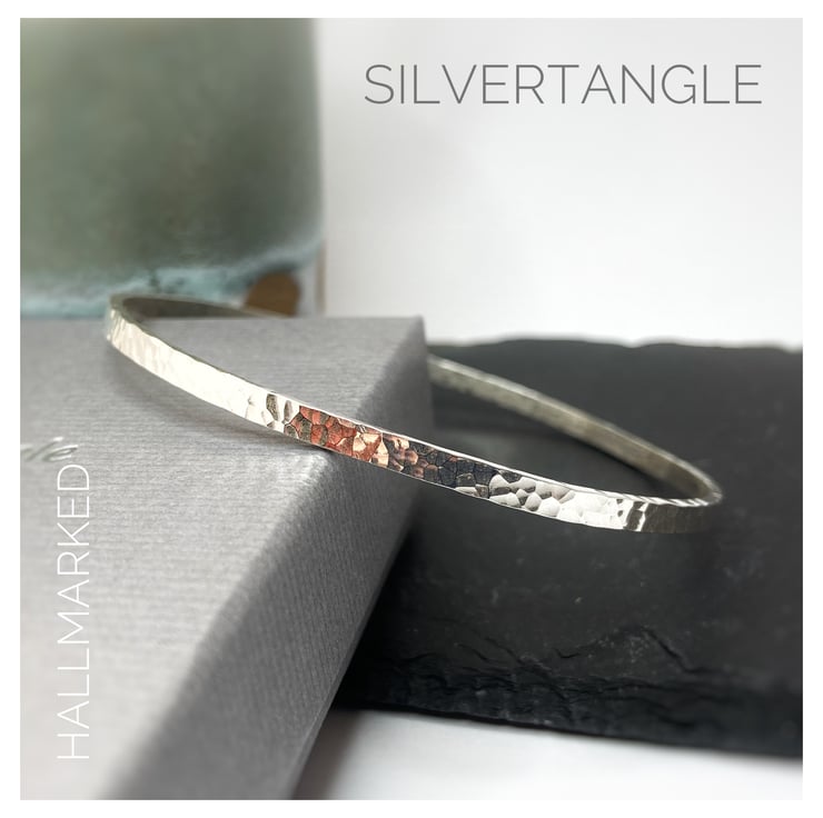 Sterling Silver Bangle - 3mm wide and 1.5mm thick. Finished with a hammered texture which catches the light and looks beautiful. Hallmarked by the Edinburgh Assay Office.