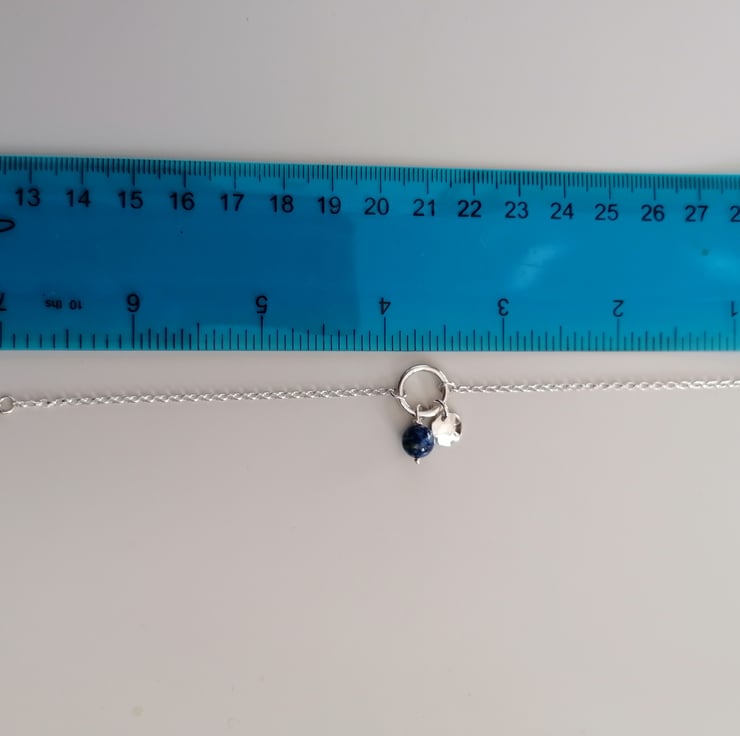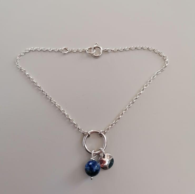 It has a 11mm wire circle with 7mm hammered disc and a 6mm Lapis lazuli bead that move freely on it. A belcher chain is connected to the circle. It has bolt ring fitting and can be worn at either just over 7" or 7 1/2". It is finished with a high polish and is stamped 925.