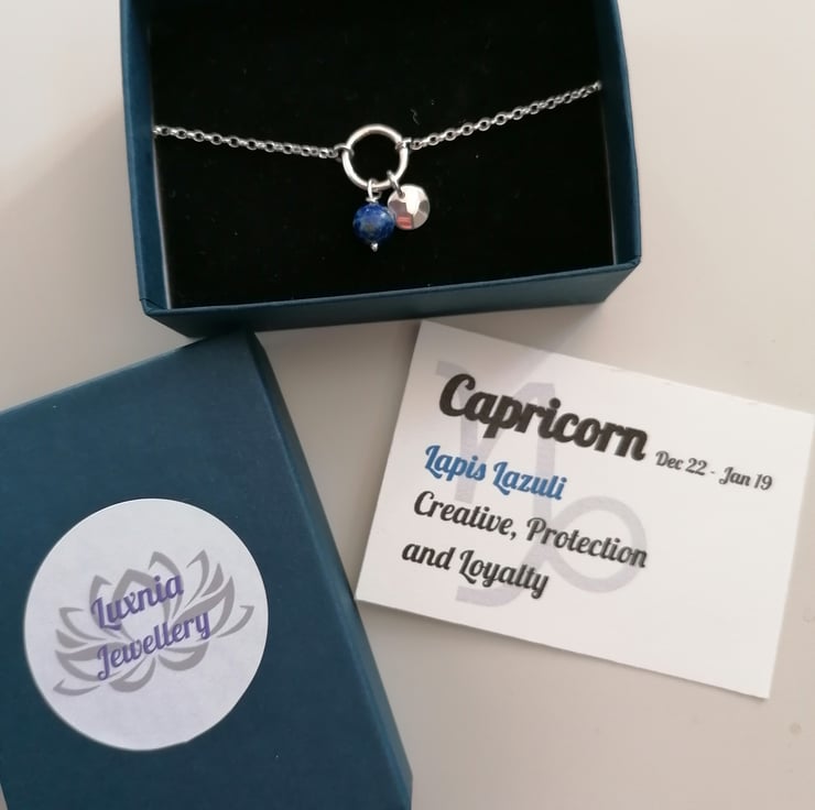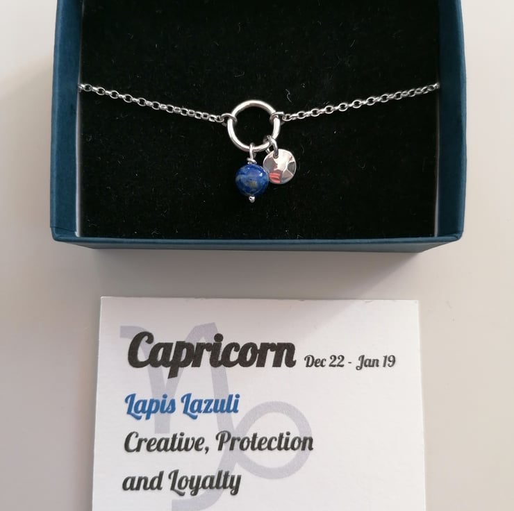This lovely bracelet is made using Sterling silver and a Lapis bead associated with the star sign Capricorn.
