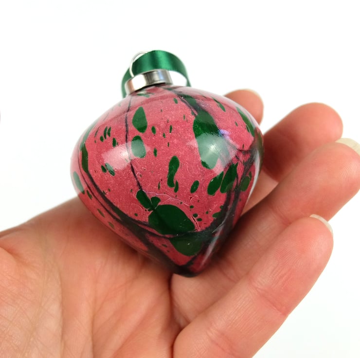 A festive combination of metallic crimson and metallic green on this marbled ceramic bauble.